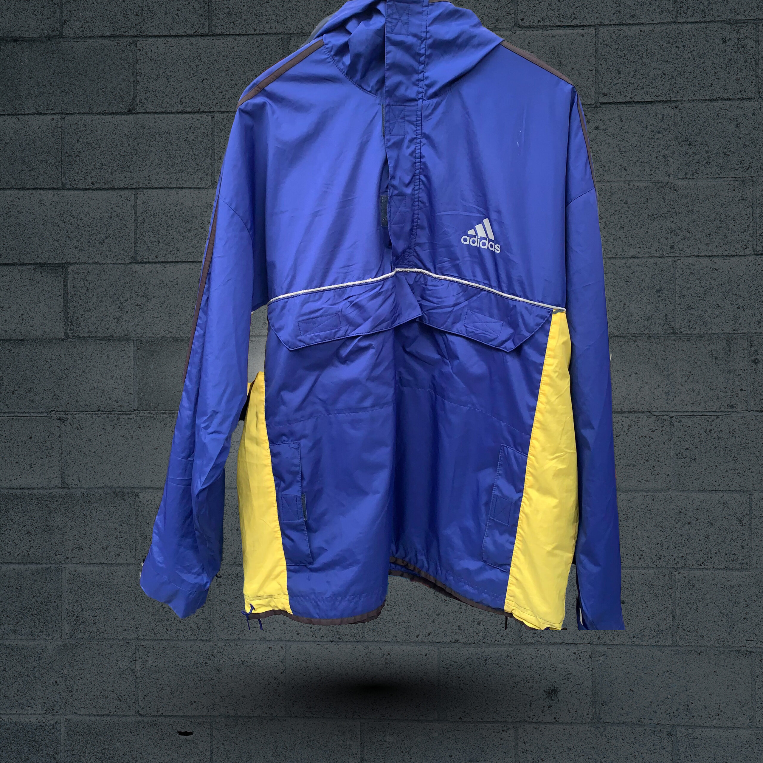 A blue and yellow Adidas windbreaker anorak jacket with a hood, a half-zip front, and front flap pockets.