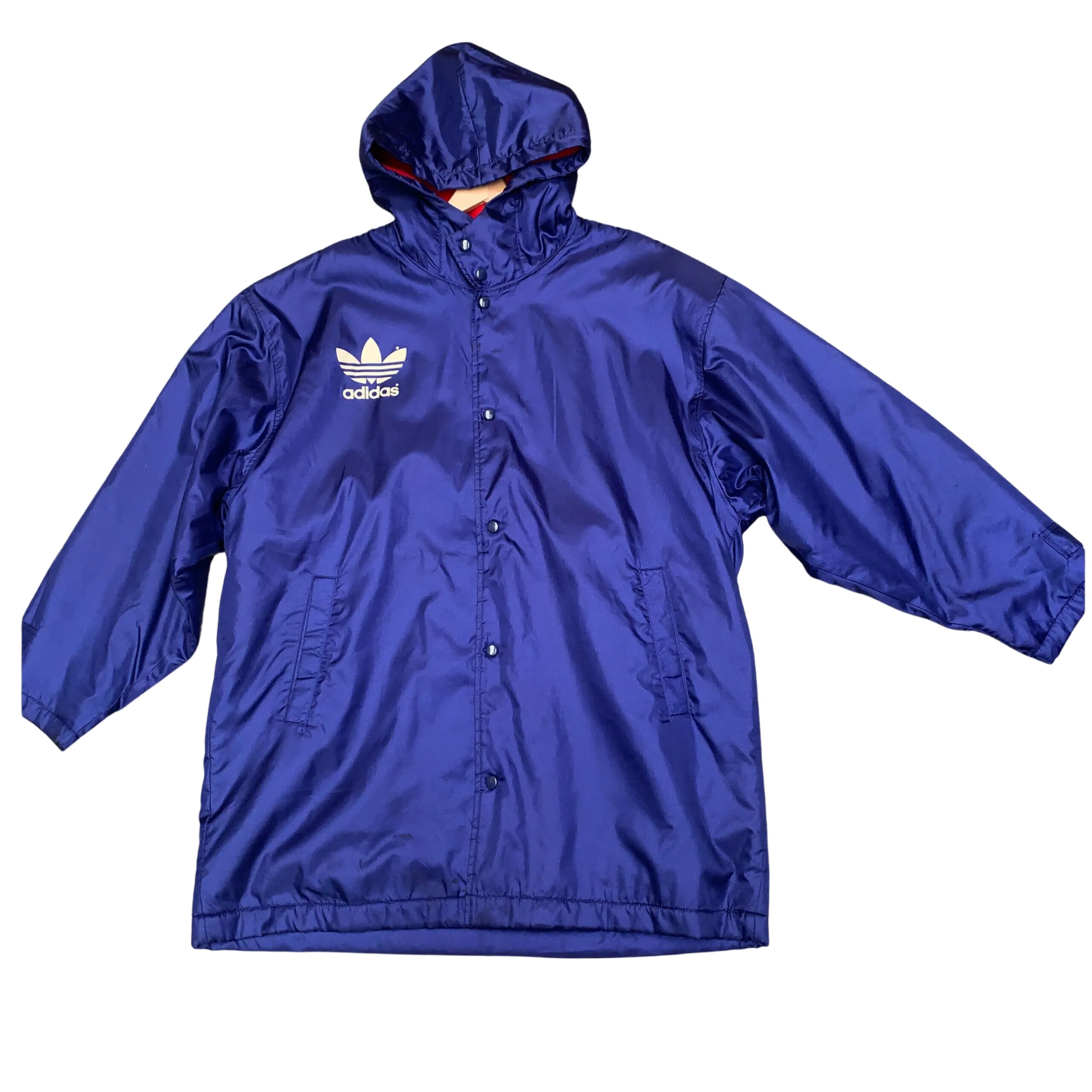 This is a genuine vintage Adidas windbreaker, crafted from a classic shiny blue nylon fabric that gives it a distinct retro look. The jacket is designed for comfort and style with a full snap-button closure and elasticized cuffs and hem. The large hood provides extra coverage and adds to its casual appeal. The standout feature is the iconic white Adidas trefoil logo on the left chest, which immediately identifies it as a piece of timeless sportswear. With its clean lines and prominent branding, this jacket is a perfect find for collectors and anyone looking to add an authentic vintage piece to their wardrobe.