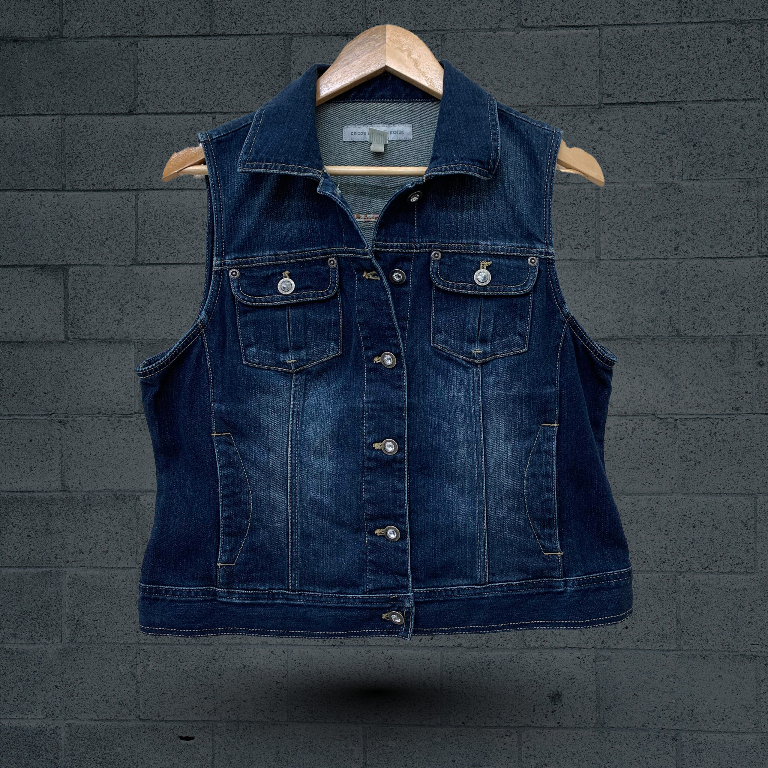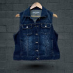 This classic dark wash blue Arizona Jeans denim vest offers a timeless and versatile layering option. Crafted from sturdy denim with subtle natural fading, it features a traditional point collar and a full button-front closure adorned with shiny silver-toned metal buttons. The vest is designed with two practical chest pockets, each secured with a buttoned flap, and two additional vertical slit pockets at the lower front for convenience. Its sleeveless design makes it an ideal piece for casual wear, easily adaptable for various seasons and outfits, adding a touch of classic denim style.