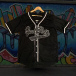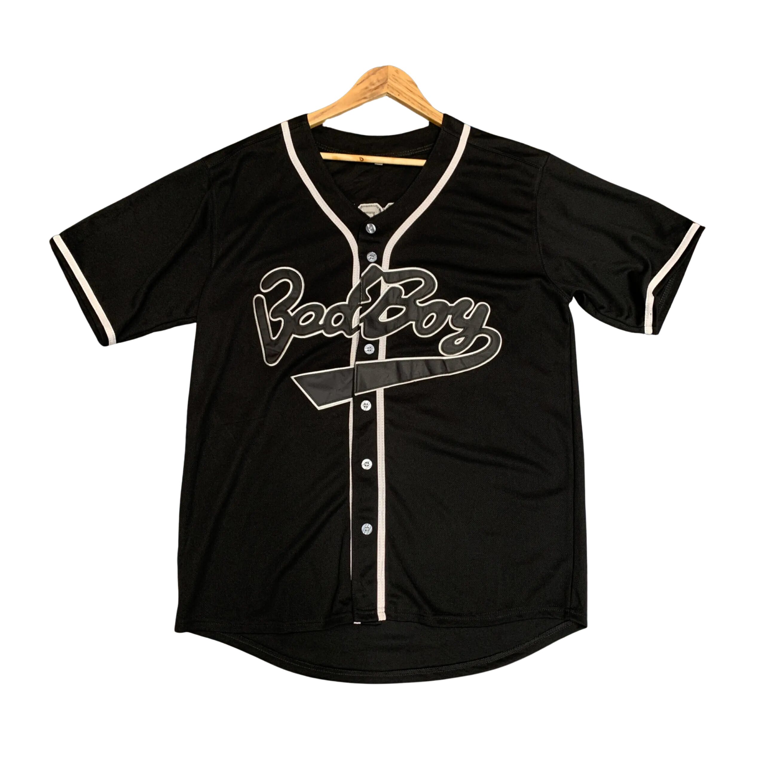This black baseball jersey combines classic sportswear style with bold streetwear flair. Designed with crisp white trim along the V-neck collar, button placket, and sleeves, it offers a striking contrast that enhances its sleek look. The jersey features six white buttons down the front for closure, giving it an authentic baseball-inspired design. Across the chest, the word “Bad Boy” is displayed in a large, flowing cursive script, outlined in white for a standout effect. Hung neatly on a wooden hanger against a grey wooden panel background, this jersey embodies a blend of athletic edge and casual everyday wear.