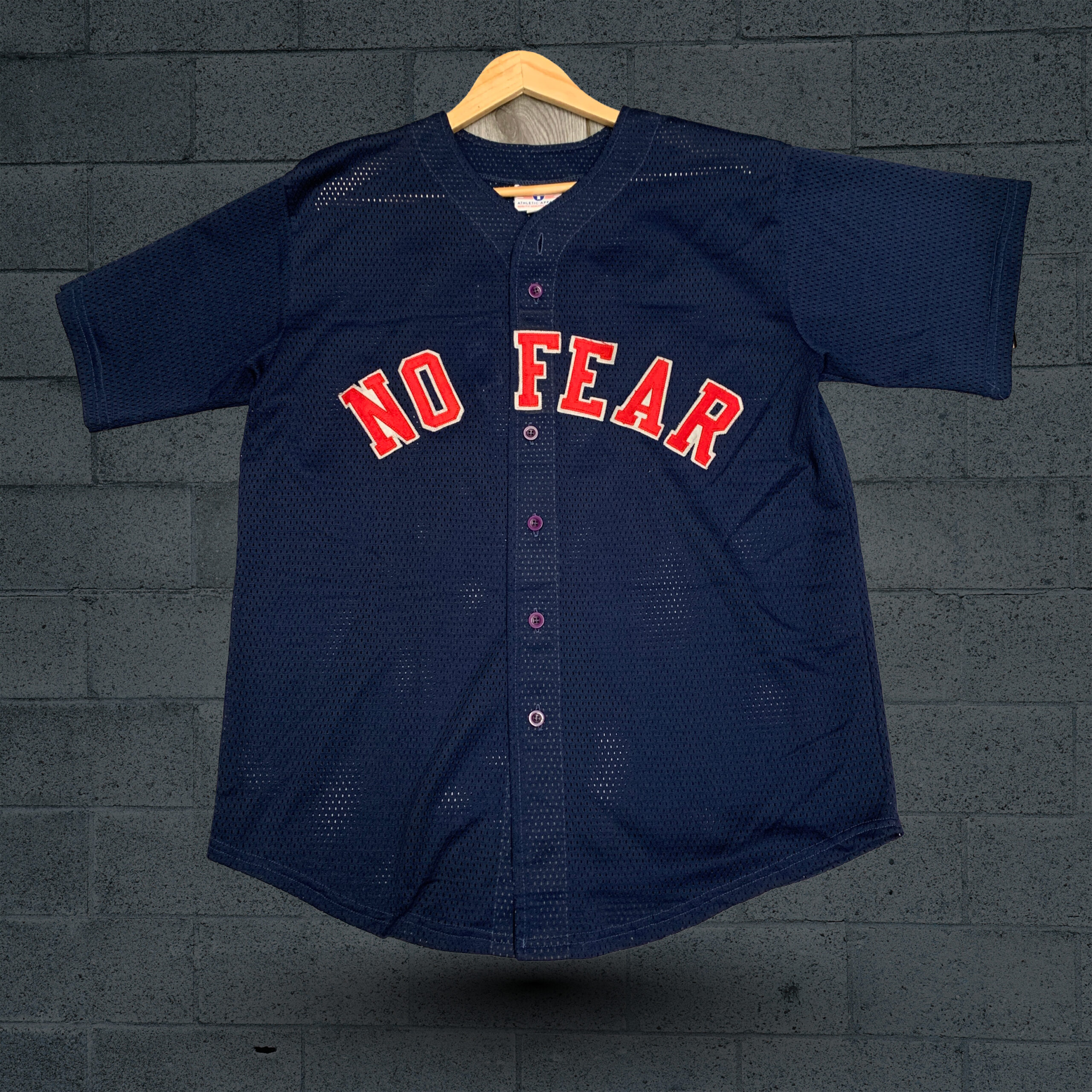 Throw it back in style with this vintage-inspired No Fear baseball jersey. Featuring a classic navy body with bold red script lettering, this piece channels the raw energy of 90s streetwear and skate culture. The relaxed fit, button-up front, and breathable mesh-like fabric deliver that old-school athletic feel, while the iconic No Fear logo reminds everyone you play by your own rules. Whether you’re hitting the park, the streets, or just keeping the attitude alive, this jersey brings the heat with serious retro flavor.