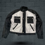 This Belstaff windbreaker showcases a bold black-and-white design with a white body and black sleeves for a sporty, stylish look. It features two large chest pockets with snap buttons and zippers, accented by the Belstaff logo on the left. The jacket closes with snap buttons down the front and includes a waist belt with buckle for a tailored fit. A high stand-up collar adds a rugged edge, while the grey wooden floor background highlights its sharp details.