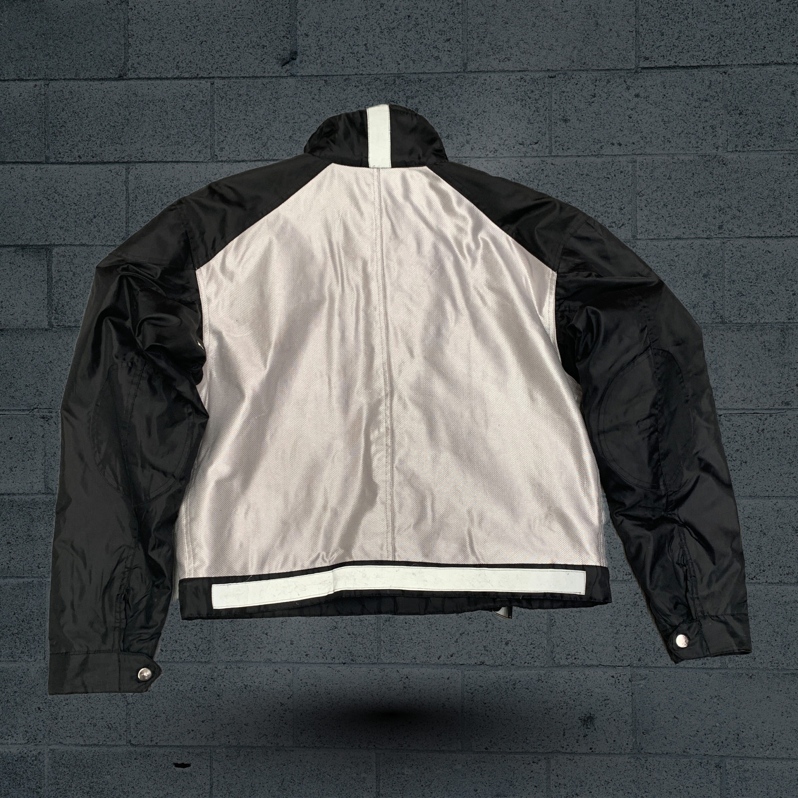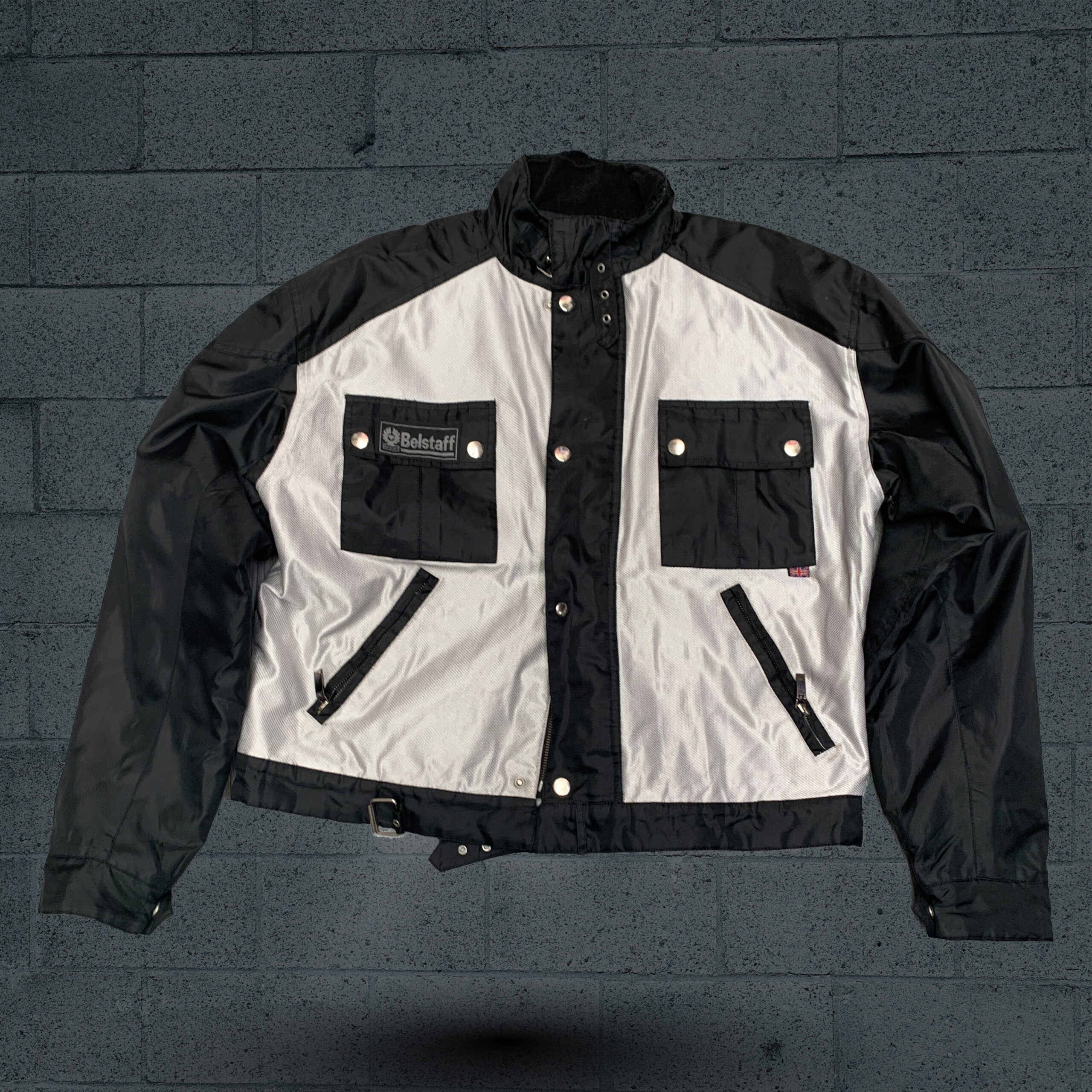 This Belstaff jacket is a black and white windbreaker with snap buttons and zippered pockets. It has a belt at the waist and a high collar. The design is sporty and stylish, laid out on a grey wood floor showcasing its details.