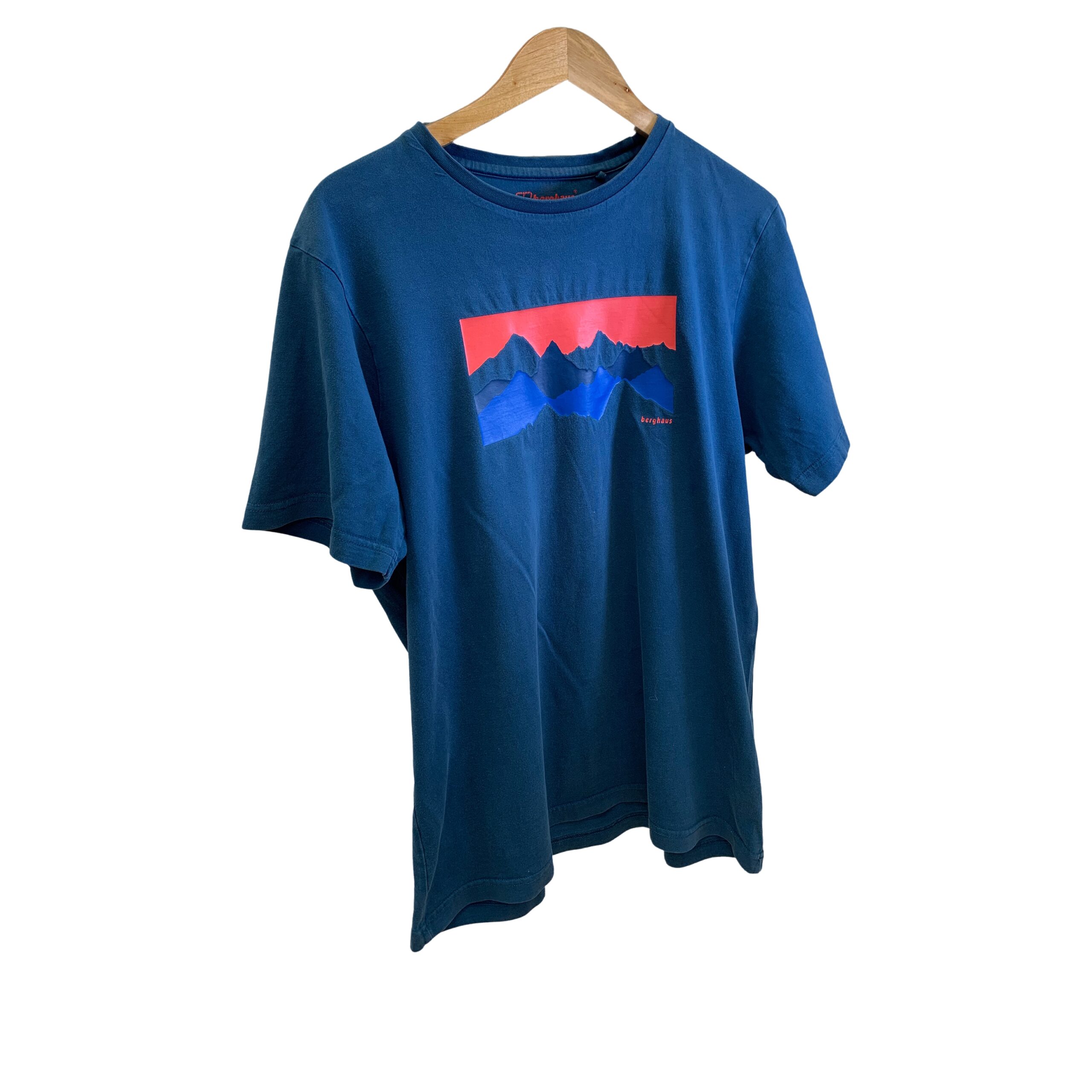 Berghaus Blue Mountain T-Shirt: Short-sleeved, dark blue t-shirt with a rectangular graphic featuring red sky and layered blue mountains, with a small Berghaus logo.