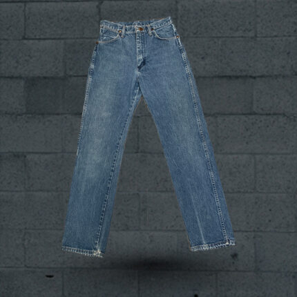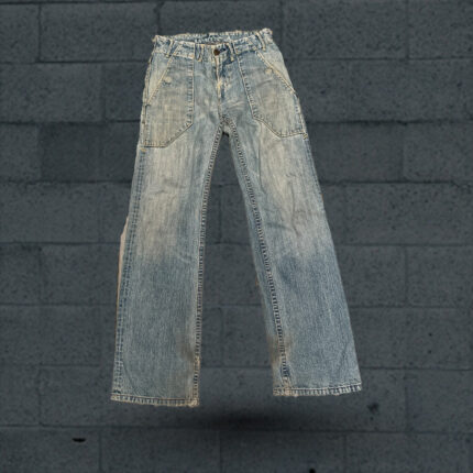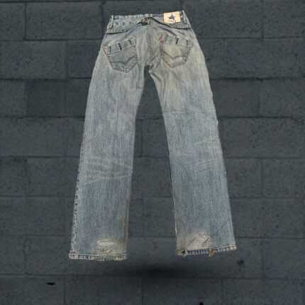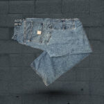 These are a pair of blue denim jeans laid out on a wooden surface. The jeans have back pockets with stitching details and a small patch on the left pocket. The denim has a faded look giving it a worn-in feel. The jeans are folded in a way that showcases the backside. There’s a light wooden floor or table beneath them. Overall, they look like casual wear jeans.
