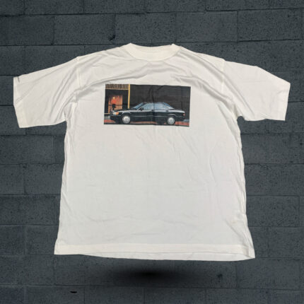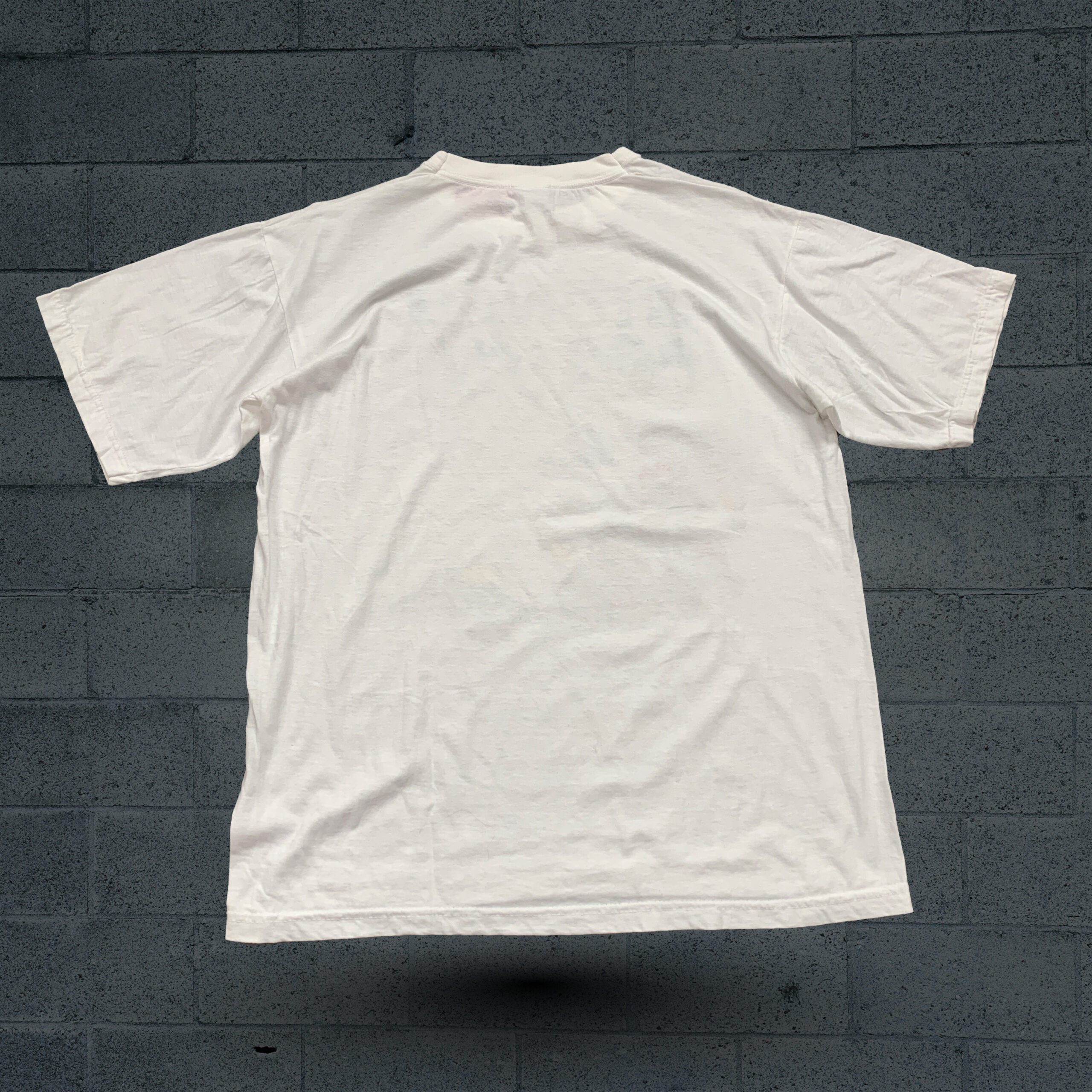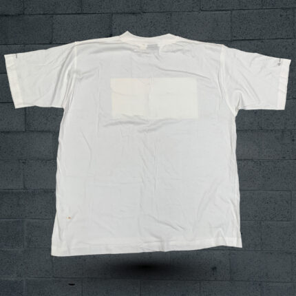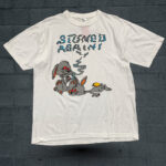 This is a novelty or vintage-style white crewneck T-shirt made from a standard cotton jersey. The shirt is characterized by its large, central graphic, which features a cartoon drawing of two gray rabbits in a compromised state, one of whom is smoking something that is emitting wisps of smoke. Above the image is the large, capitalized text “STUNED AGAIN!” (or “STONED AGAIN!”) rendered in a playful, wavy blue and green font. The style of the graphic is common for vintage 90s counterculture or novelty apparel, often associated with artists like Robert Crumb (as similar items are sometimes attributed to him). It is a classic piece of humorous, adult-themed graphic wear.