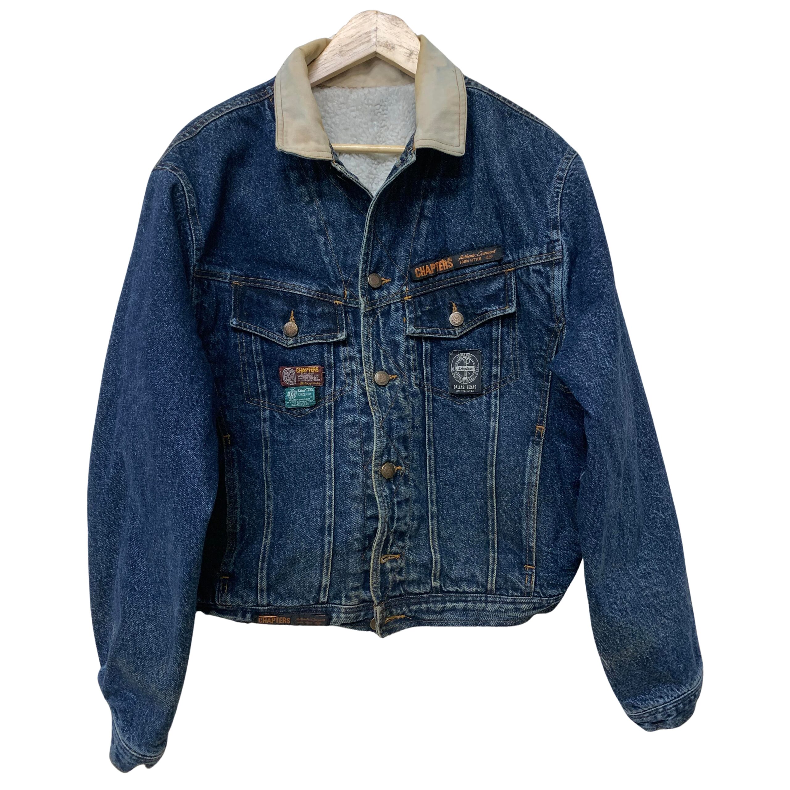 This vintage-style blue denim jacket by CHAPTERS presents a rugged yet fashionable aesthetic. It features a distinctive lighter-colored collar, possibly made of corduroy or a similar contrasting fabric, setting it apart from the main denim body. The jacket is designed with a classic button-front closure and two chest pockets with buttoned flaps. Numerous brand-specific patches and embroidered details adorn the front, including “CHAPTERS” branding above one pocket and on another lower patch, as well as a circular “MAKE IT REAL” emblem, adding to its unique character. This piece combines durable denim with branded accents, reflecting a heritage or workwear-inspired style.