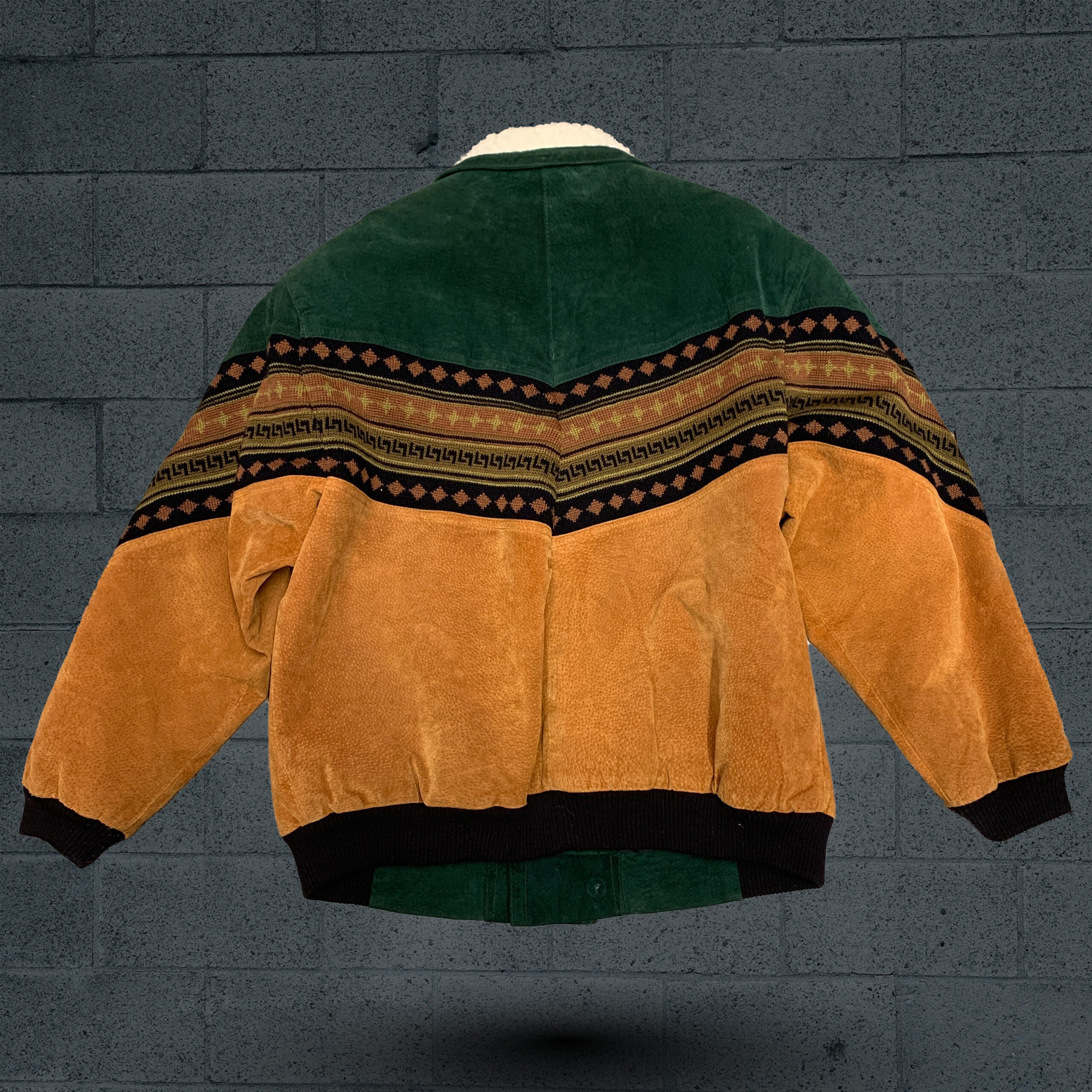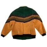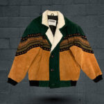 Green and black suede-style jacket featuring a warm fuzzy collar and a bold patterned design, perfect for adding both style and comfort to cooler days