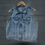 A light blue denim vest with a studded collar, front button closure, and two button-flap chest pockets.