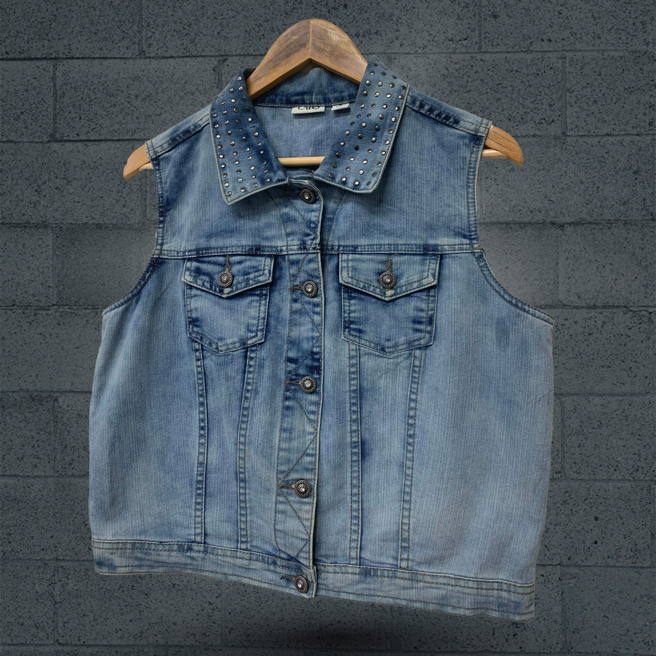 This stylish light blue denim vest offers a classic yet edgy aesthetic, perfect for layering. It features a traditional point collar heavily embellished with numerous silver-toned studs or rhinestones, adding a distinctive rock-and-roll or punk-inspired touch. The vest maintains classic denim details including a full button-front closure with metal buttons and two practical chest pockets, each secured with a buttoned flap. Its sleeveless design and versatile light wash make it an ideal piece for casual wear, easily pairing with various outfits to add a touch of cool.