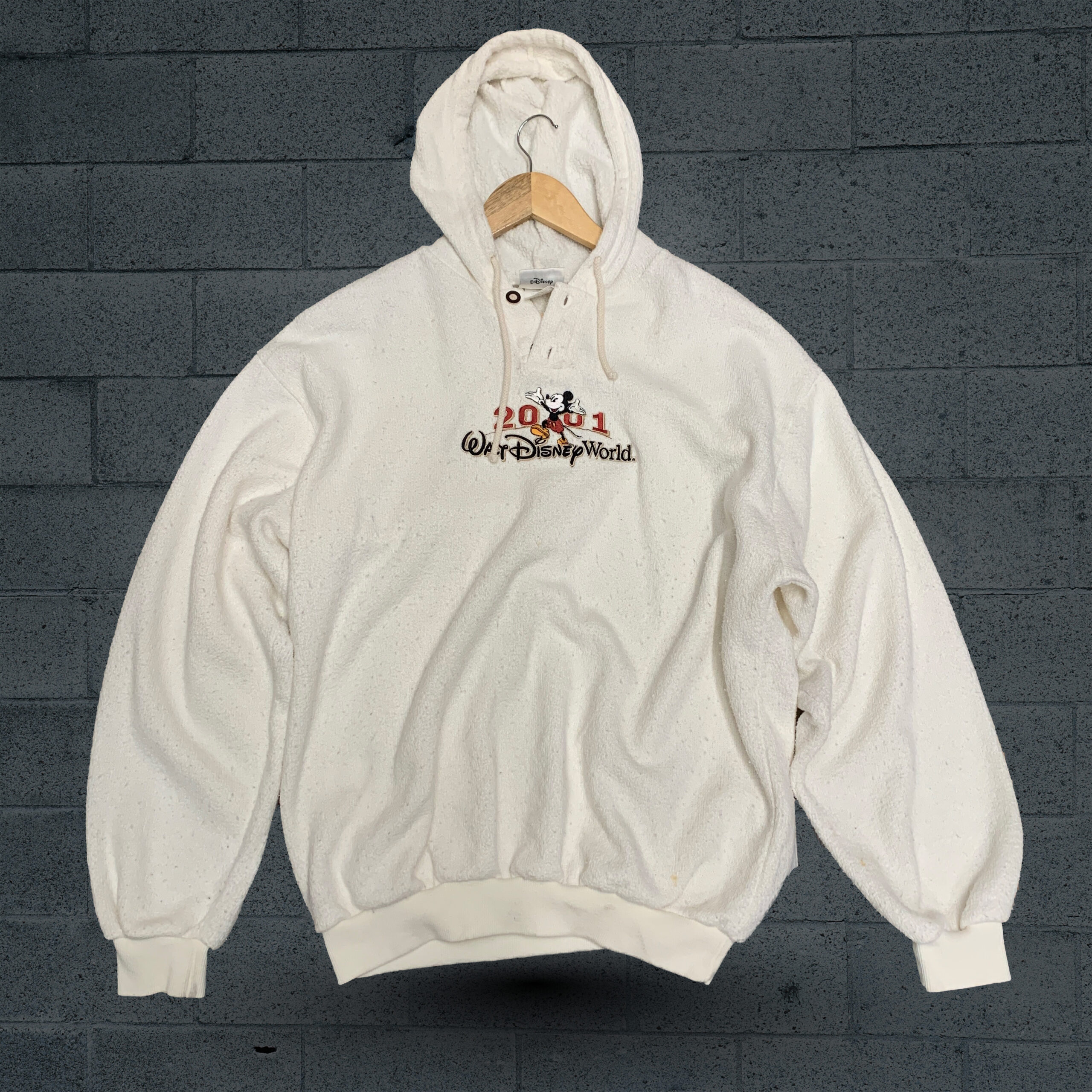 This is a cozy white hoodie made of soft and warm fabric, making it perfect for wearing in cold weather. It has long sleeves with elastic cuffs, a comfortable waistband, and a hood with adjustable drawstrings to provide extra warmth. On the front, there is a colorful design that says “2001 Walt Disney World” along with an image of Mickey Mouse, which makes it fun, unique, and eye-catching. The hoodie is not only practical for keeping warm but also stylish and special because of its Disney theme.