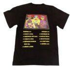 Gorillaz “Gorillaz Tour” Black T-Shirt: This is a short-sleeved, black t-shirt with a ribbed crew neck. The front of the shirt features the band’s name, “GORILLAZ,” printed in a stylized, bright neon green script. The back of the shirt displays a rectangular graphic featuring a colorful, cartoon-style portrait of the four band members. Below the graphic, a list of tour dates from November 2010 is printed in a light, faded font, including venues in Dublin, Manchester, London, Amsterdam, Birmingham, Brighton, Berlin, Paris, and Antwerp.