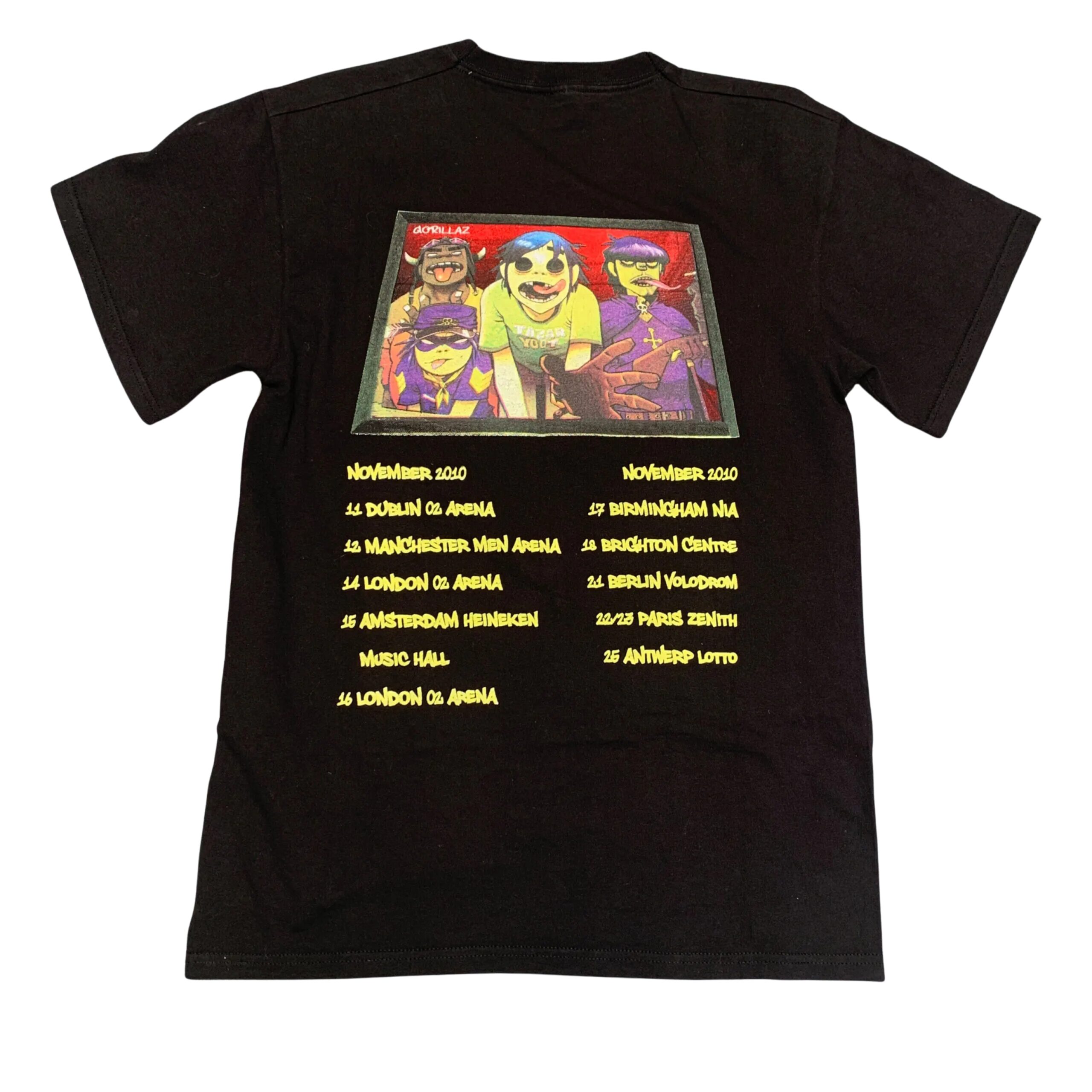 Gorillaz Tour T-Shirt: Black, short-sleeved t-shirt with a green “GORILLAZ” logo on the front and a band portrait graphic with November 2010 tour dates on the back.