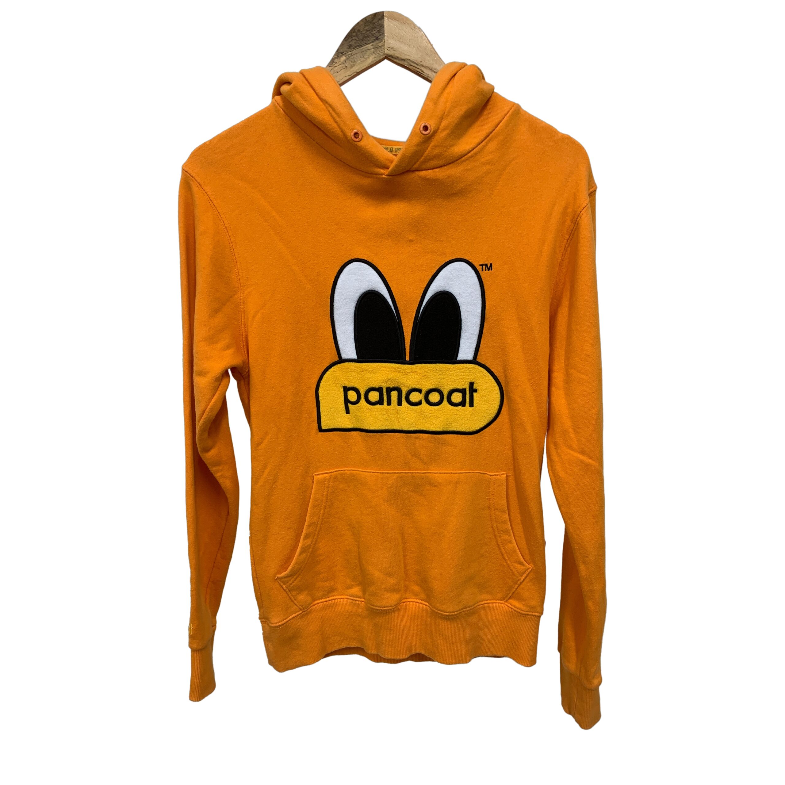The hoodie in the image is a vibrant and eye-catching piece of clothing from the pancoat brand. It’s an orange hoodie with long sleeves, featuring a kangaroo pocket at the front for storing small items like hands or keys. The hoodie has a hood with two wide eye motifs on the front. The standout feature of this hoodie is the large graphic on the front, depicting a pair of cartoonish eyes with big white highlights and black pupils, sitting atop a yellow oval with the brand name “pancoat” written in bold black letters. Please note the drawstring is missing on this item.