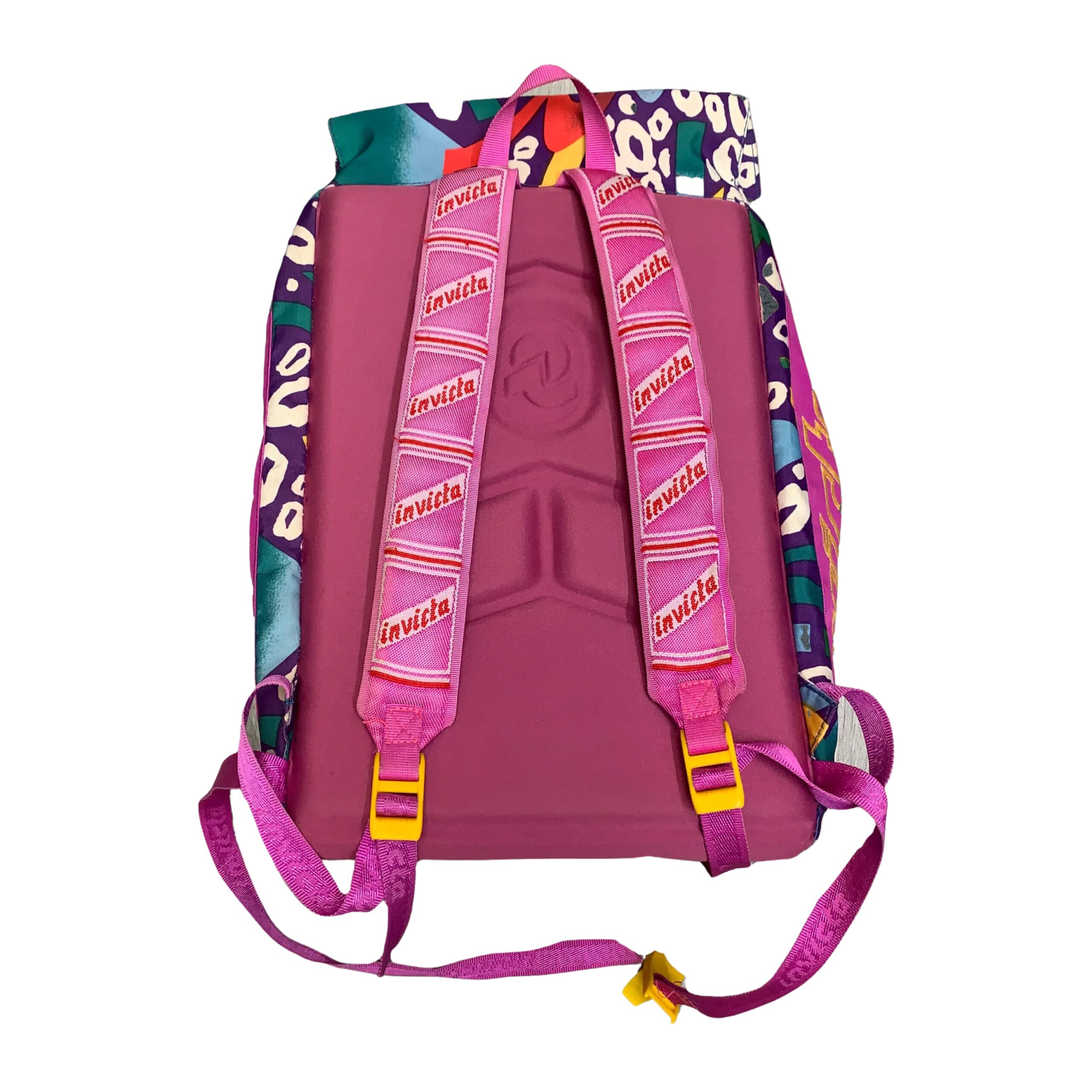 Invicta “Jolly Ski-World Cup” Backpack: A vintage-style backpack with a purple, blue, and green abstract pattern, magenta front pocket with “Jolly Ski-World Cup” embroidered text, and yellow straps.