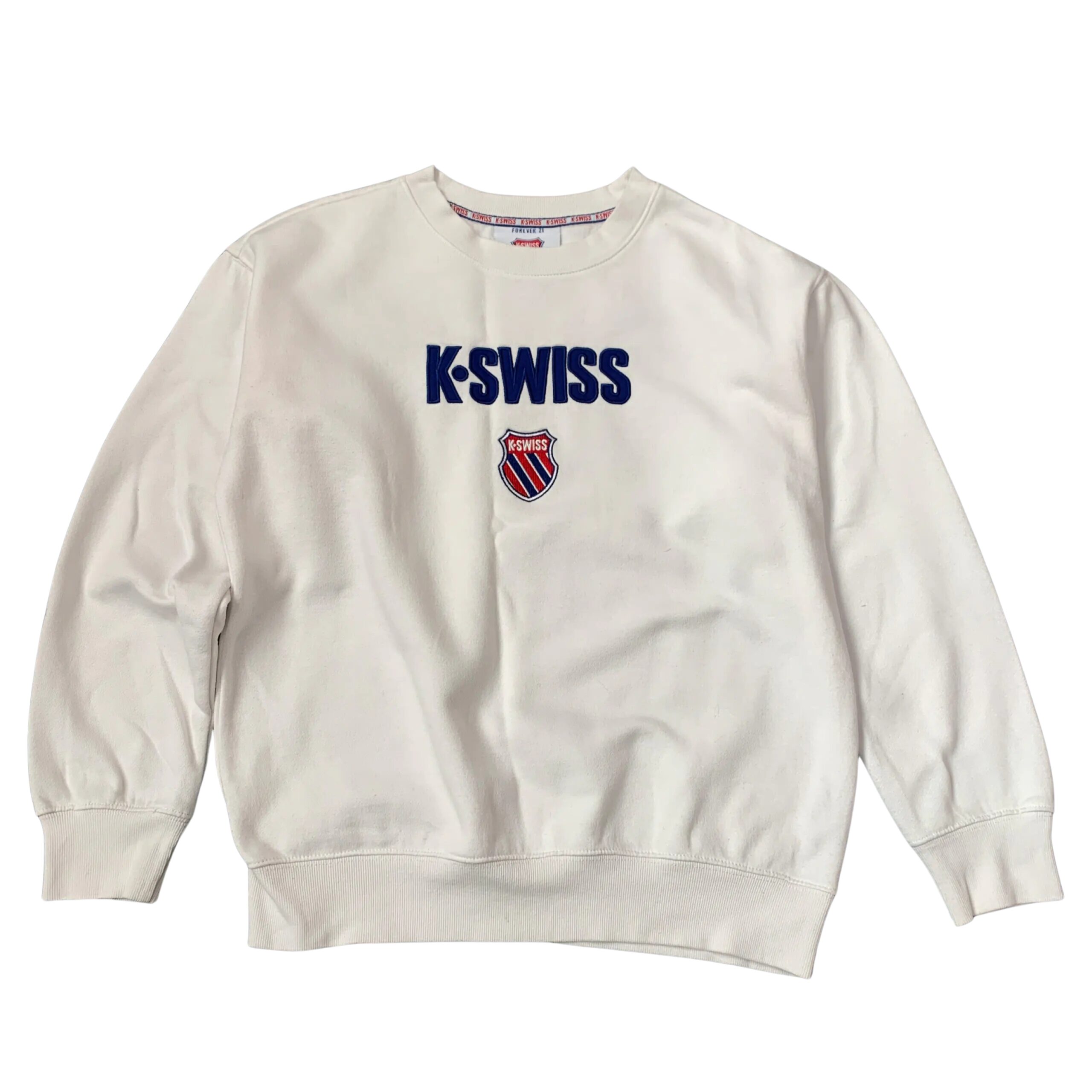 White K-Swiss sweatshirt with blue logo print. Casual crewneck top. Perfect for everyday wear.
