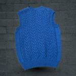 A blue cable knit sleeveless sweater laid on a grey brick wall. It’s a cozy knit piece with a crew neck