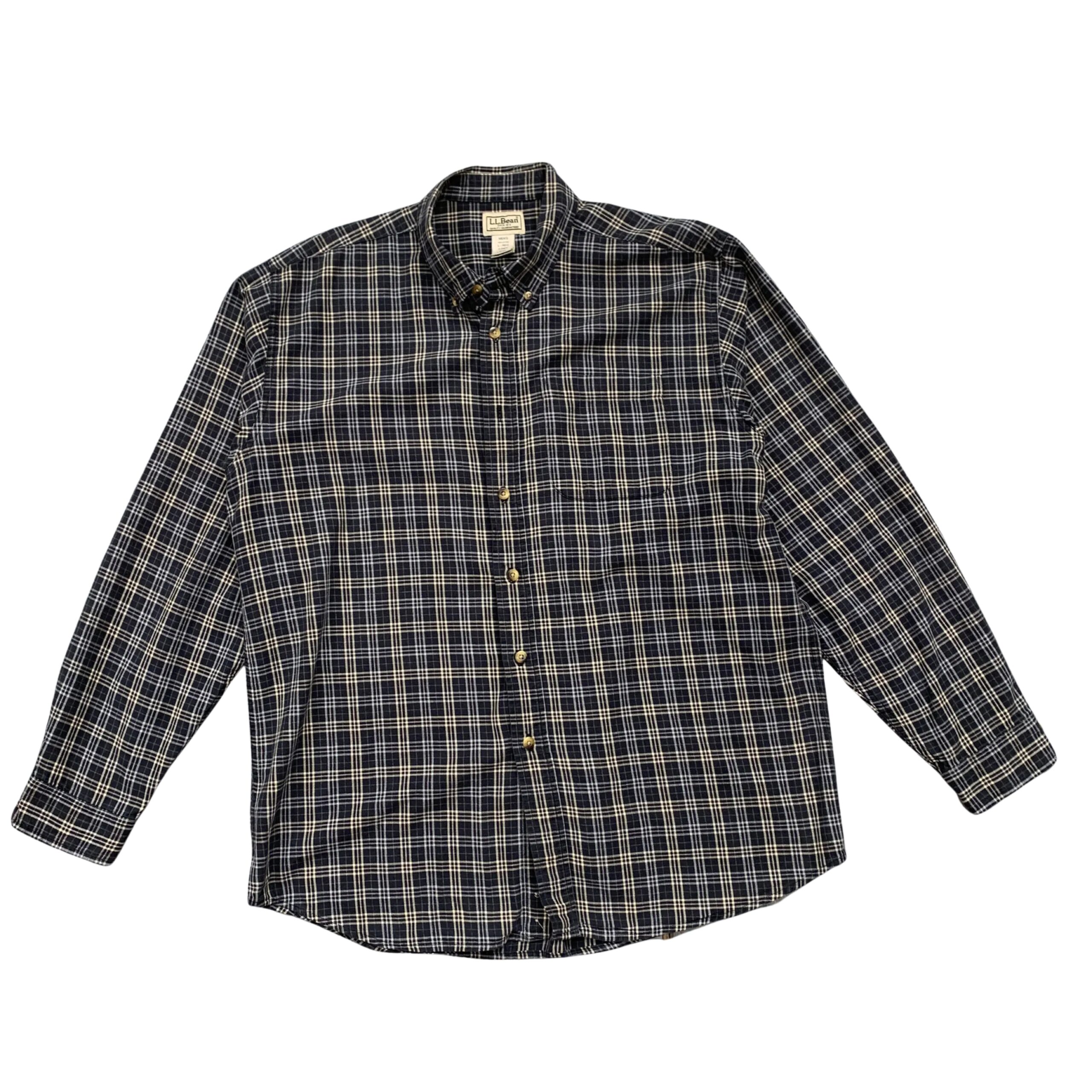 A classic men’s long-sleeve button-down shirt from L.L.Bean featuring a dark, finely woven plaid pattern in shades of black, gray, and cream/tan.