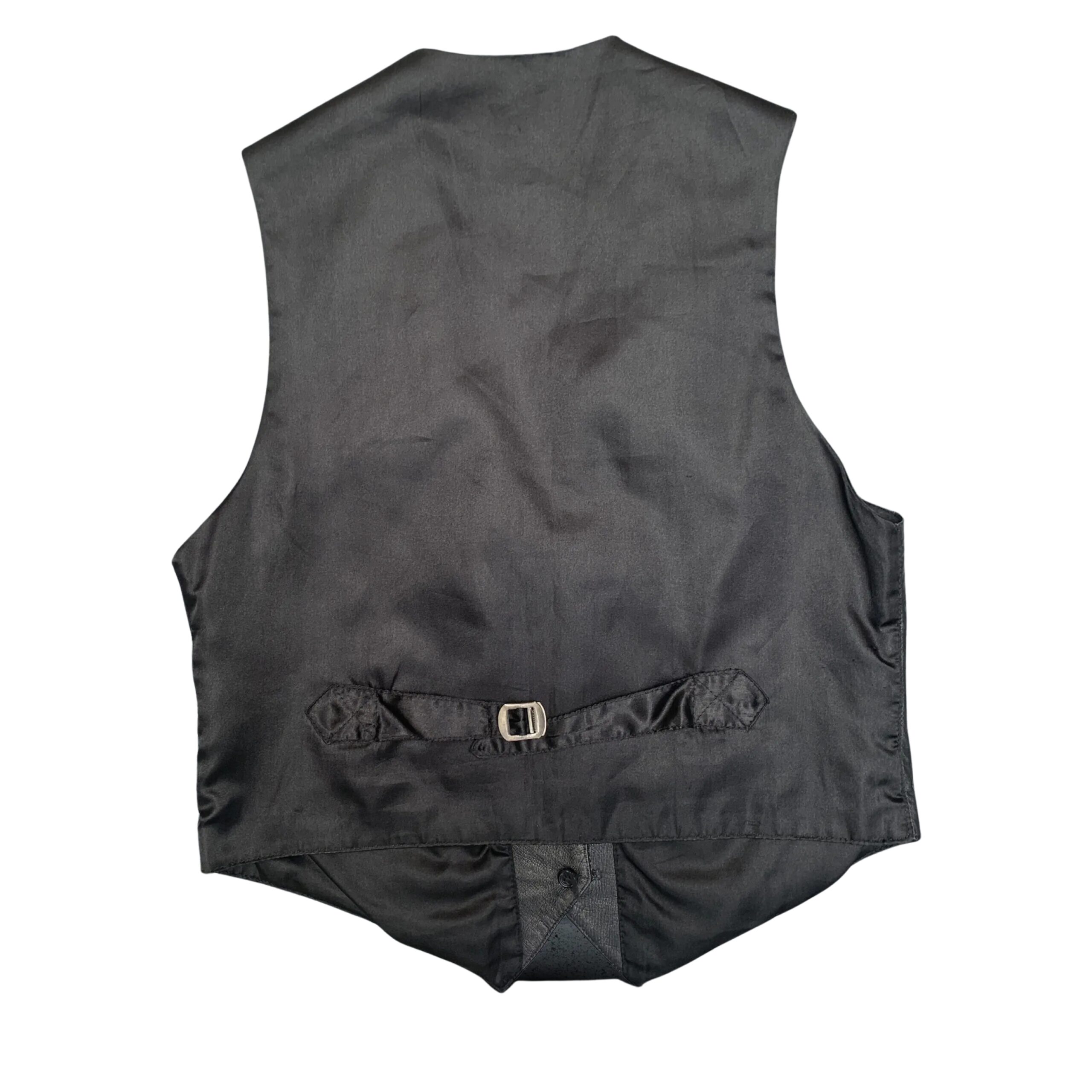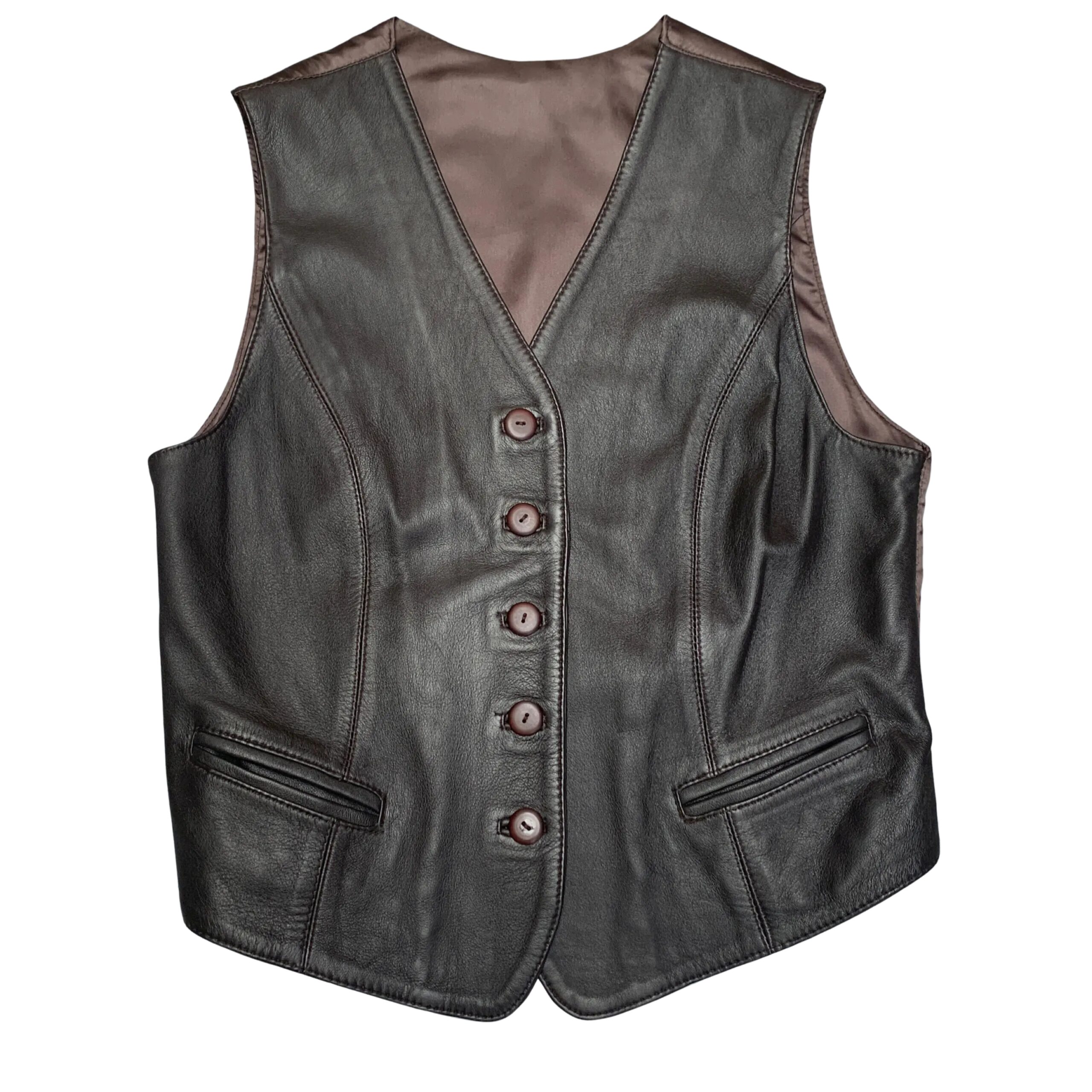 A classic black leather vest with a button-down front. It features a sleek design with two front pockets and an adjustable strap on the back, perfect for a rugged or edgy look.