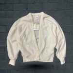 This is an off-white cropped cardigan with buttons down the front. It has long sleeves with cuffs and a tag still attached indicating it’s brand new. The cardigan is laid flat against a dark grey brick wall background. The garment looks comfy and casual. The Levi’s tag is visible on the inside. A shadow is cast below the cardigan.