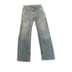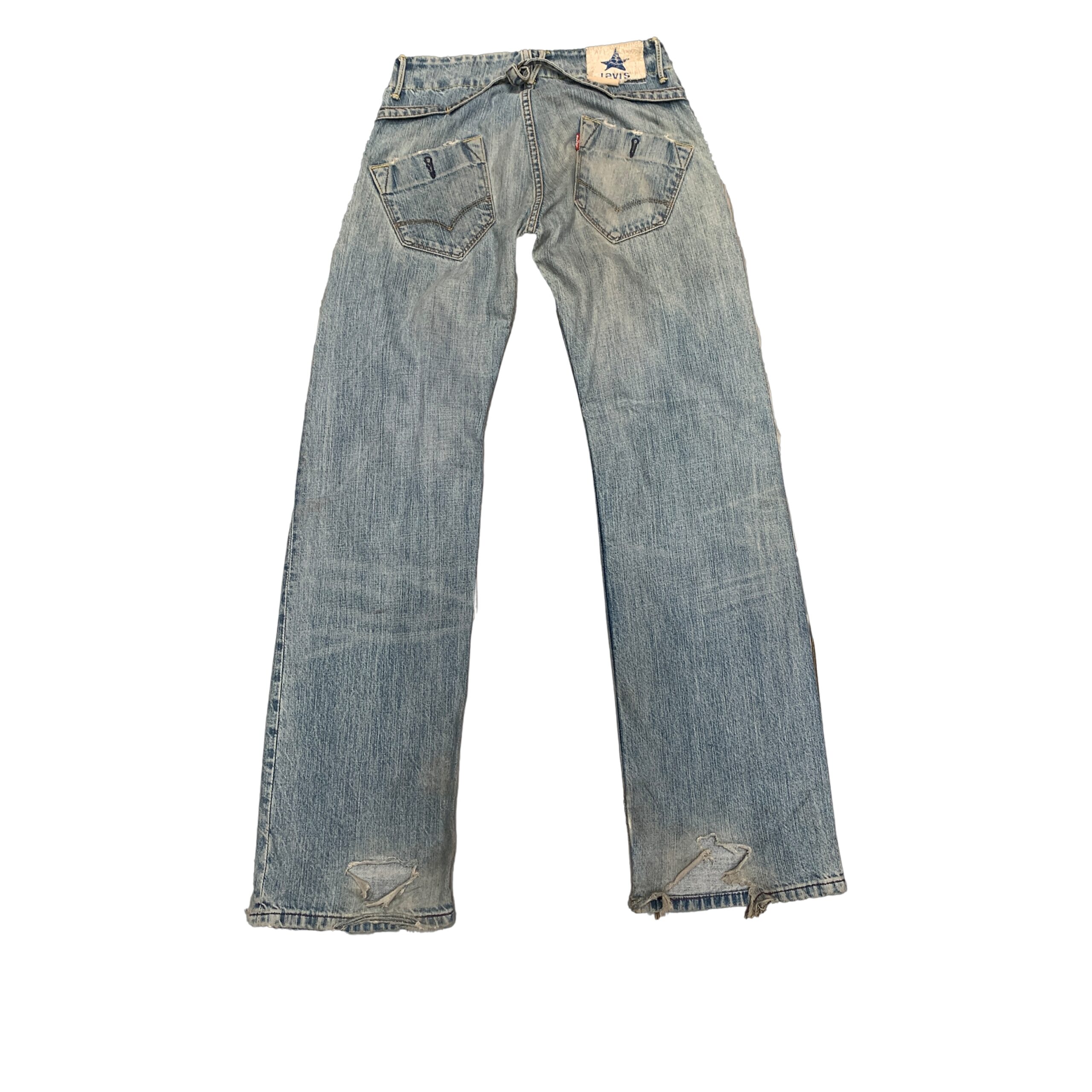 Vintage light-wash Levi’s jeans with a unique, baggy fit and distressed details. They feature cargo-style back pockets, an adjustable cinch strap on the back waistband, and a distinctive Levi’s patch with a star logo.