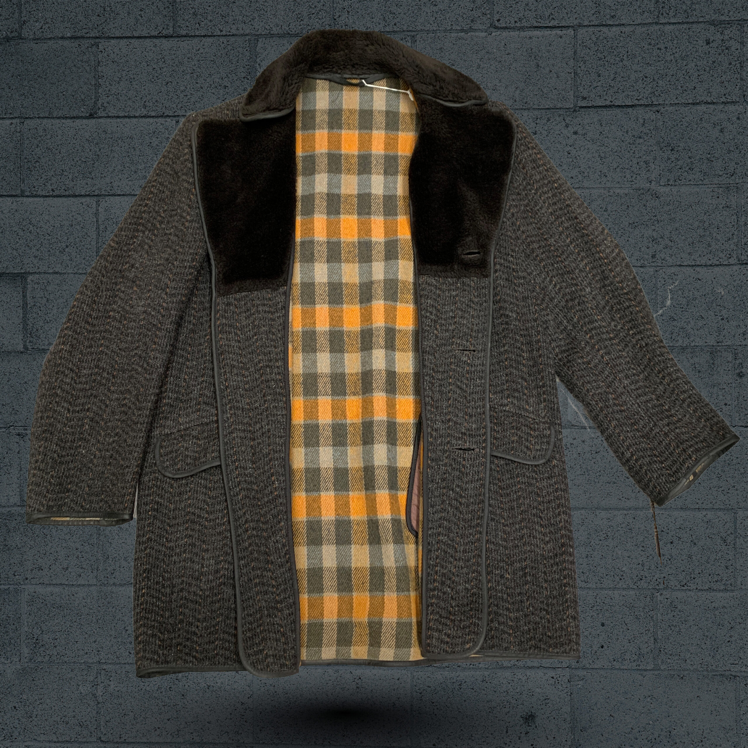 Dark gray tweed-style jacket with faux fur collar trim, plaid inner lining, button closure, and two side pockets.