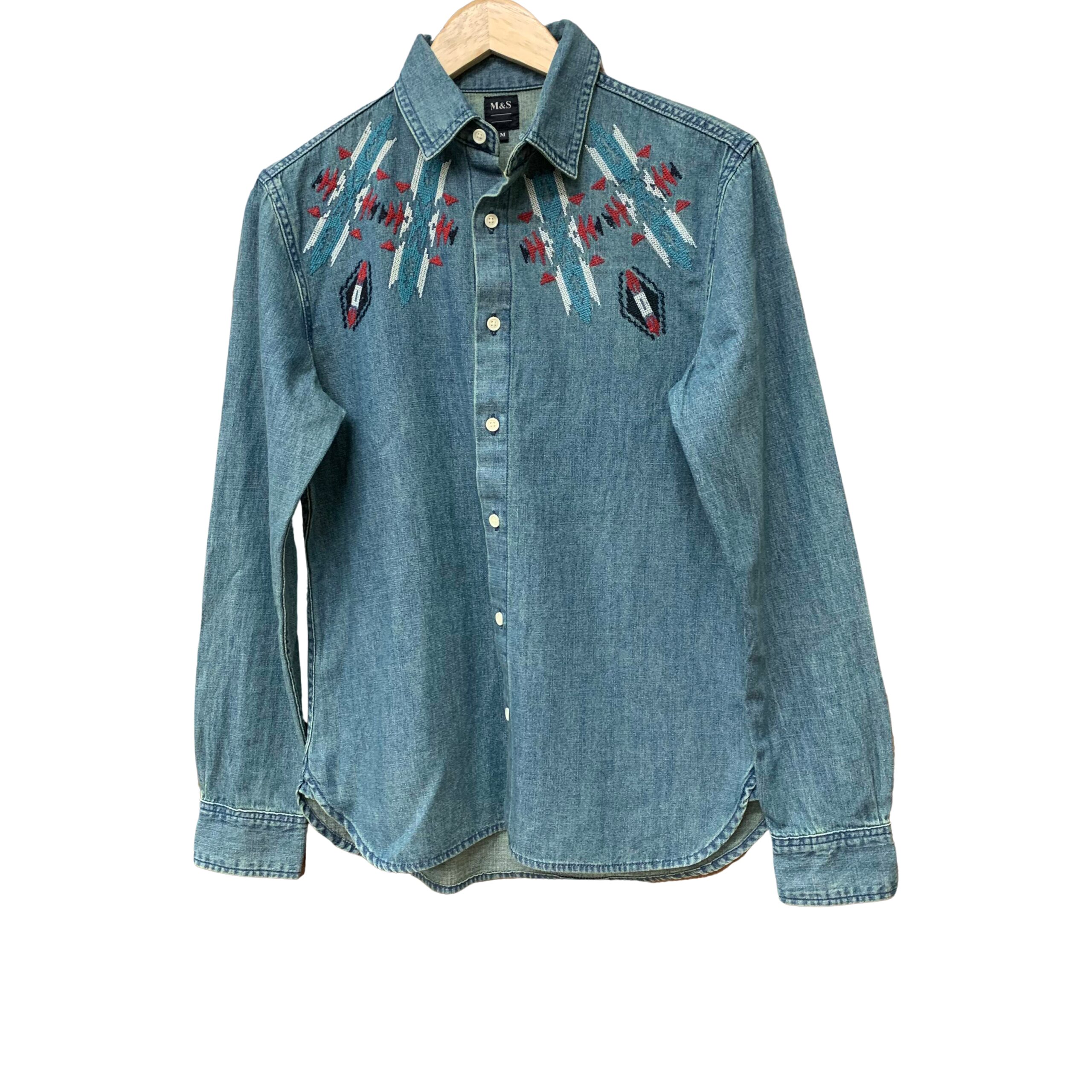 A blue M&S denim shirt featuring vibrant red, blue, and white Southwestern-style embroidery across the shoulders and chest, with a classic collar and button front.