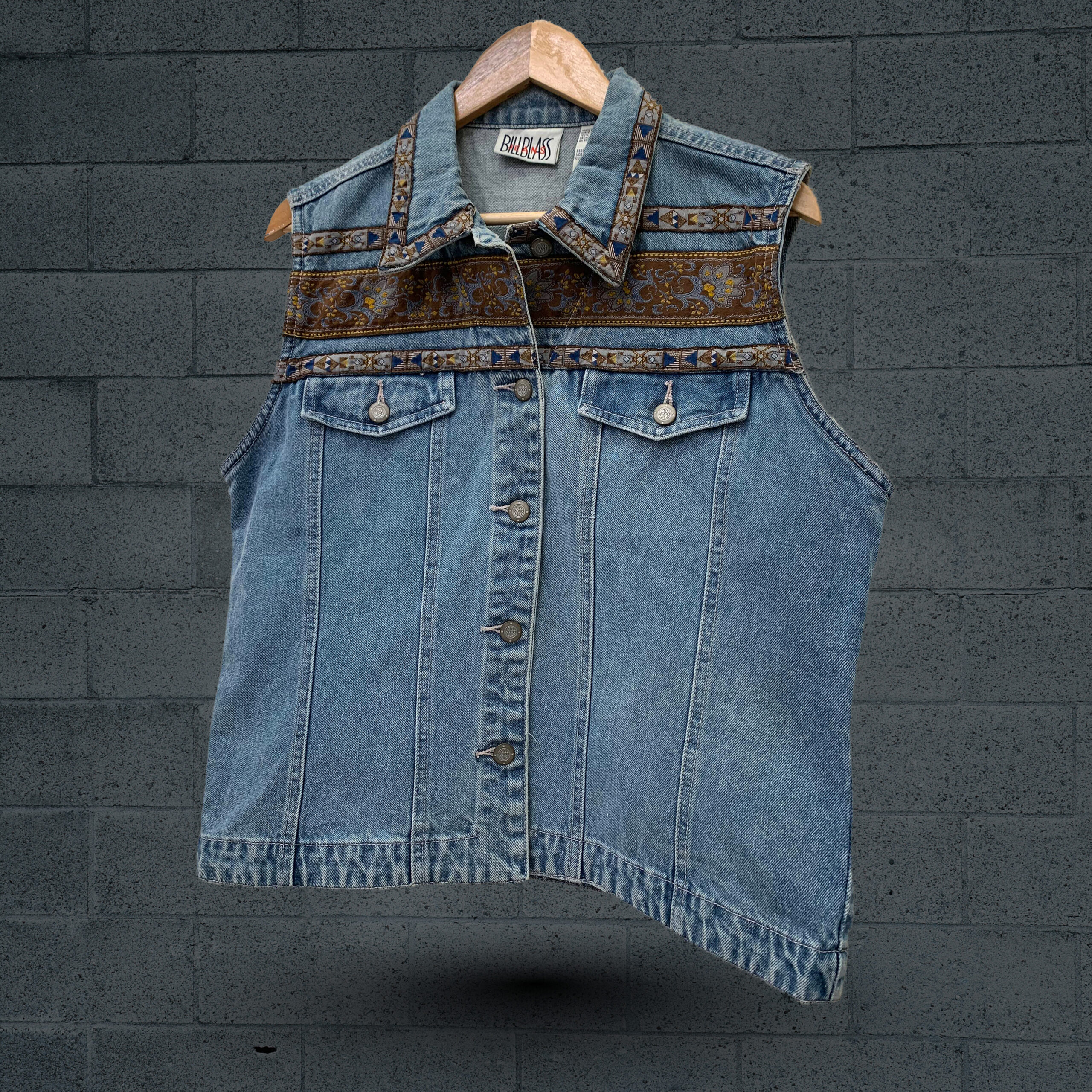 This stylish y2k maurices denim vest offers a contemporary and edgy take on a classic. Crafted from a medium to light wash blue denim, it features brown patterned design on the front chest and collar, adding to its lived-in appeal. The vest is designed with a traditional point collar and a full button-front closure, accented by unique metal buttons. It includes two practical chest pockets with decorative curved flaps and button fasteners. The sleeveless design is finished with raw, frayed edges around the armholes, contributing to its modern cut-off aesthetic. Vertical seams provide a flattering, shaped fit, making this a versatile layering piece for a casual and trendy look.