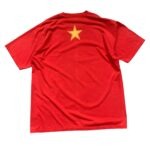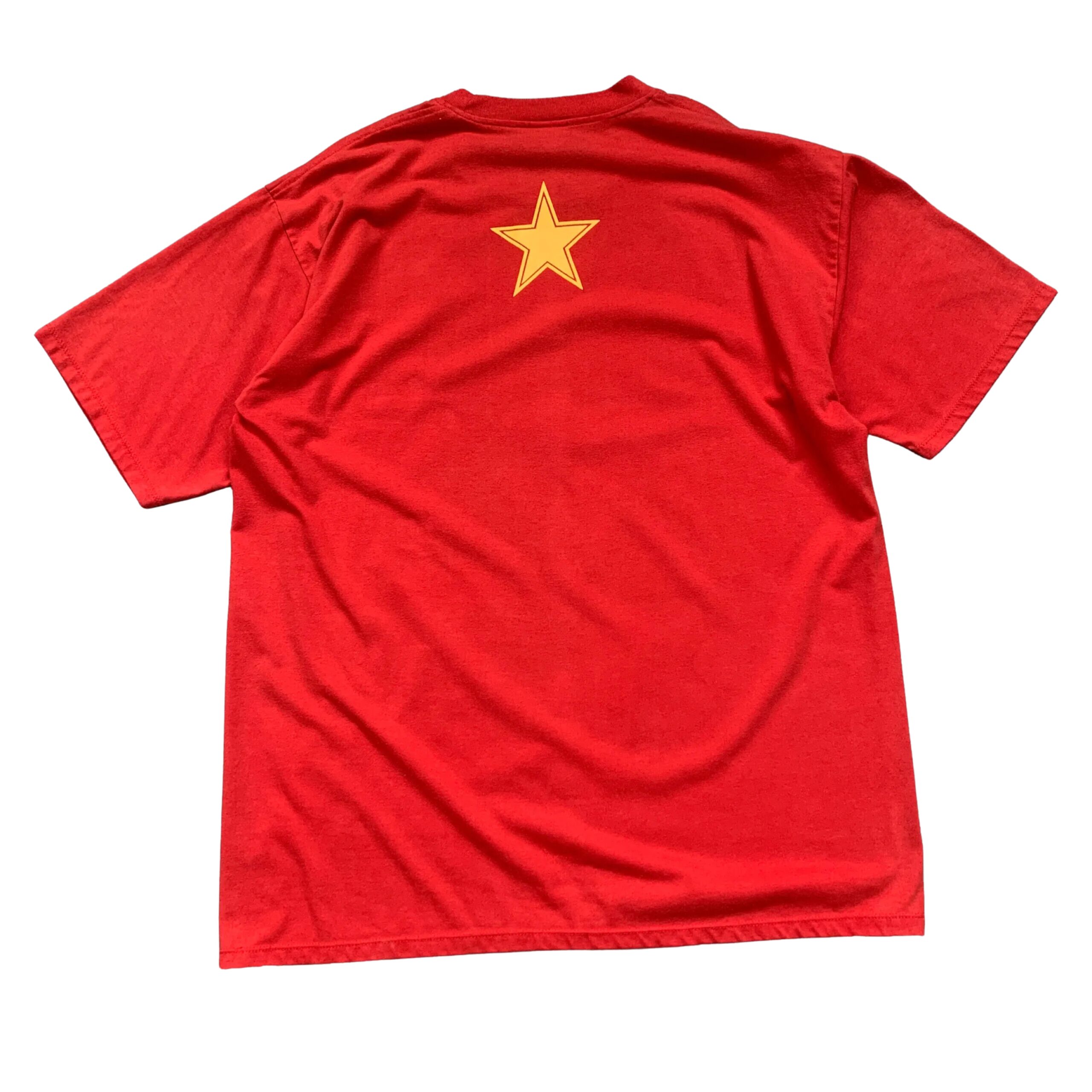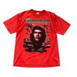 A bold, red short-sleeve t-shirt featuring a large graphic of Che Guevara’s face surrounded by tanks and fighter jets.