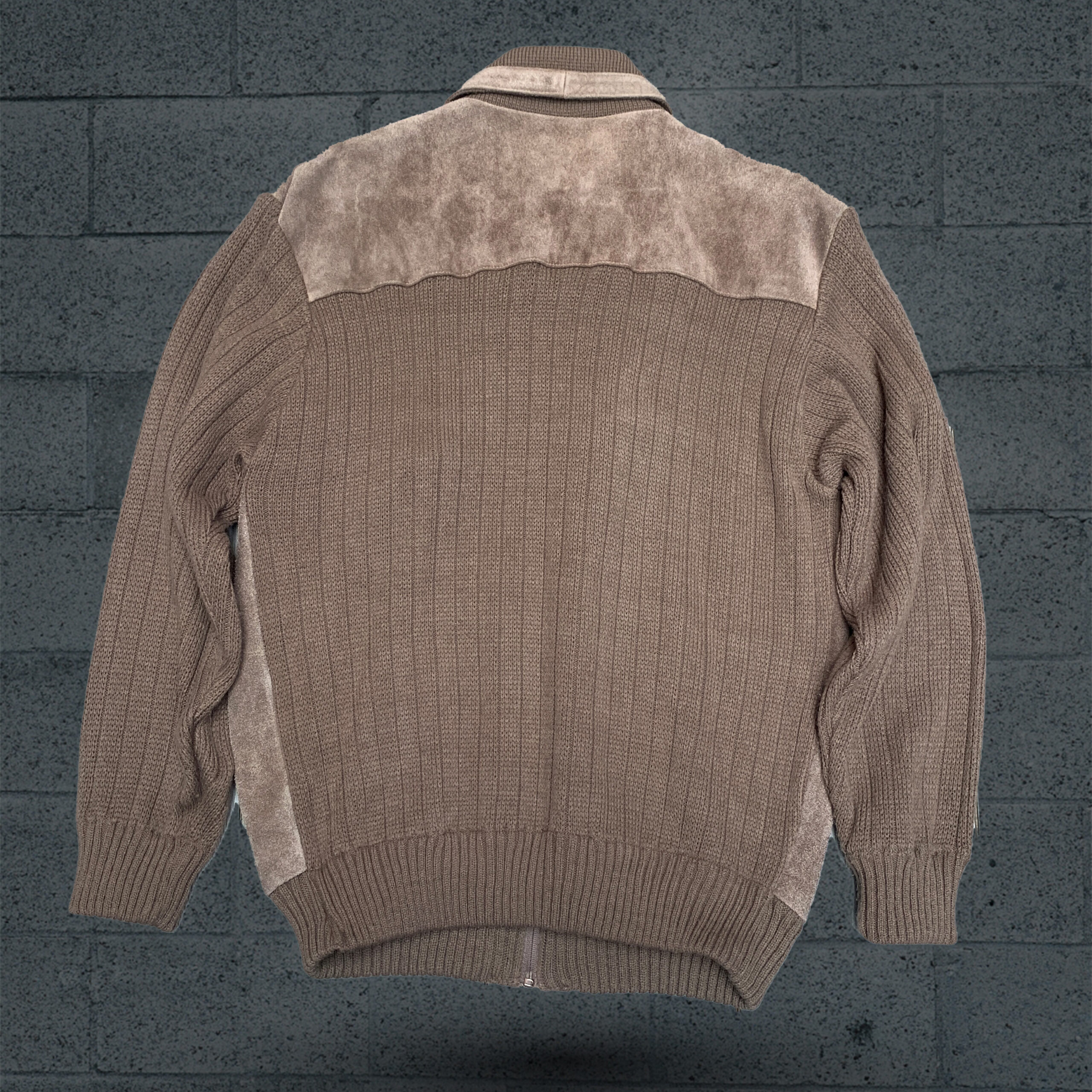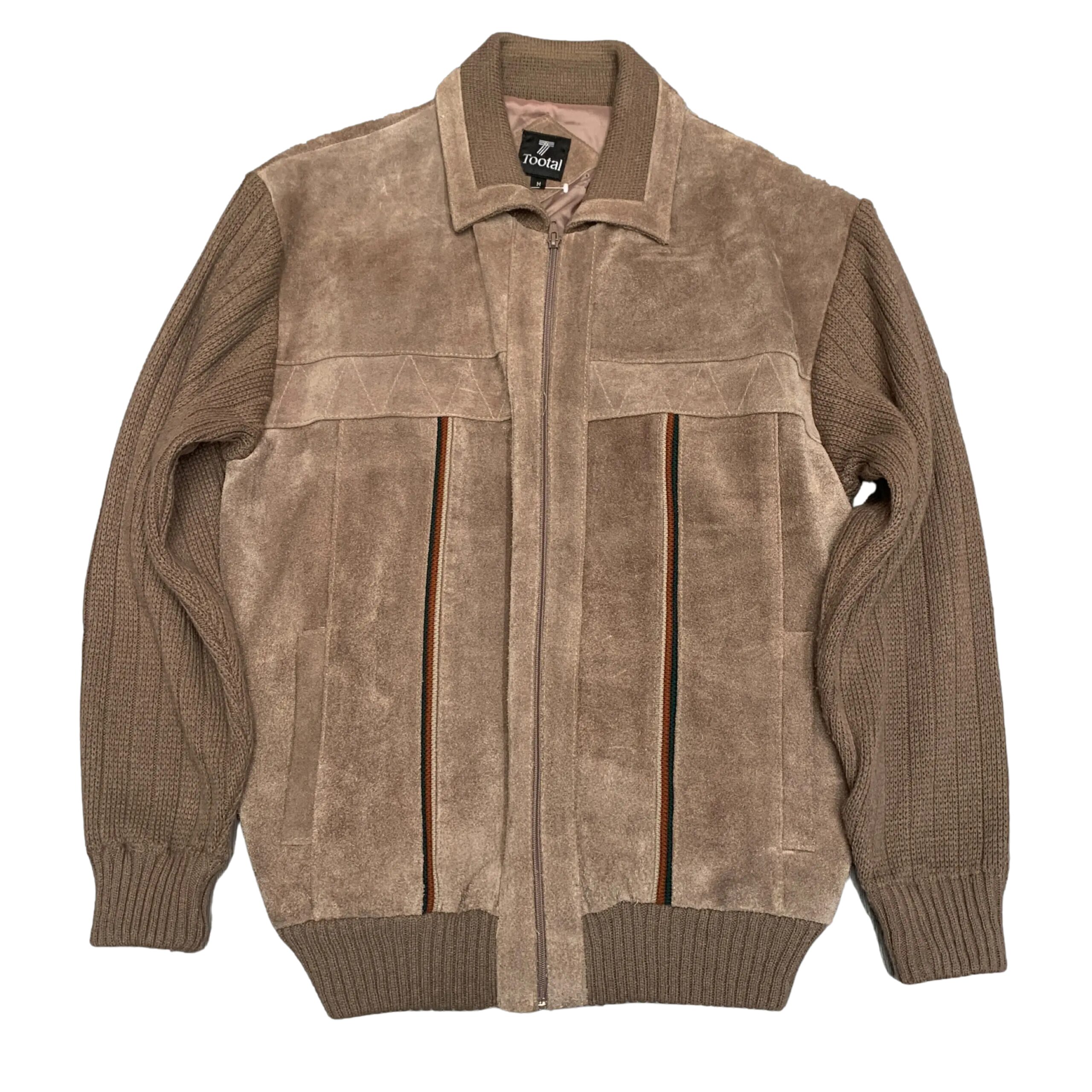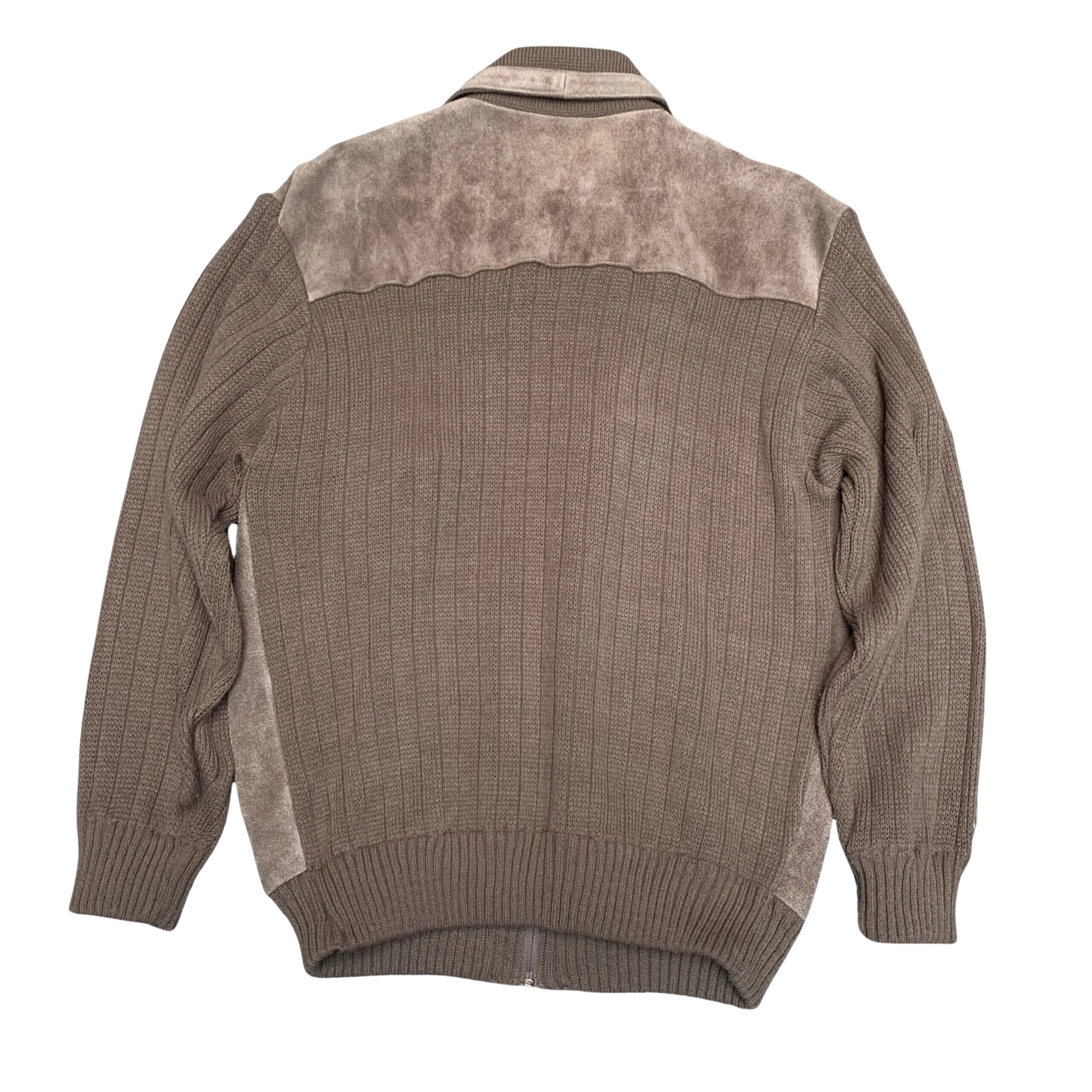 A vintage-style men’s jacket featuring a suede body, knitted wool sleeves, and a full-zip front.