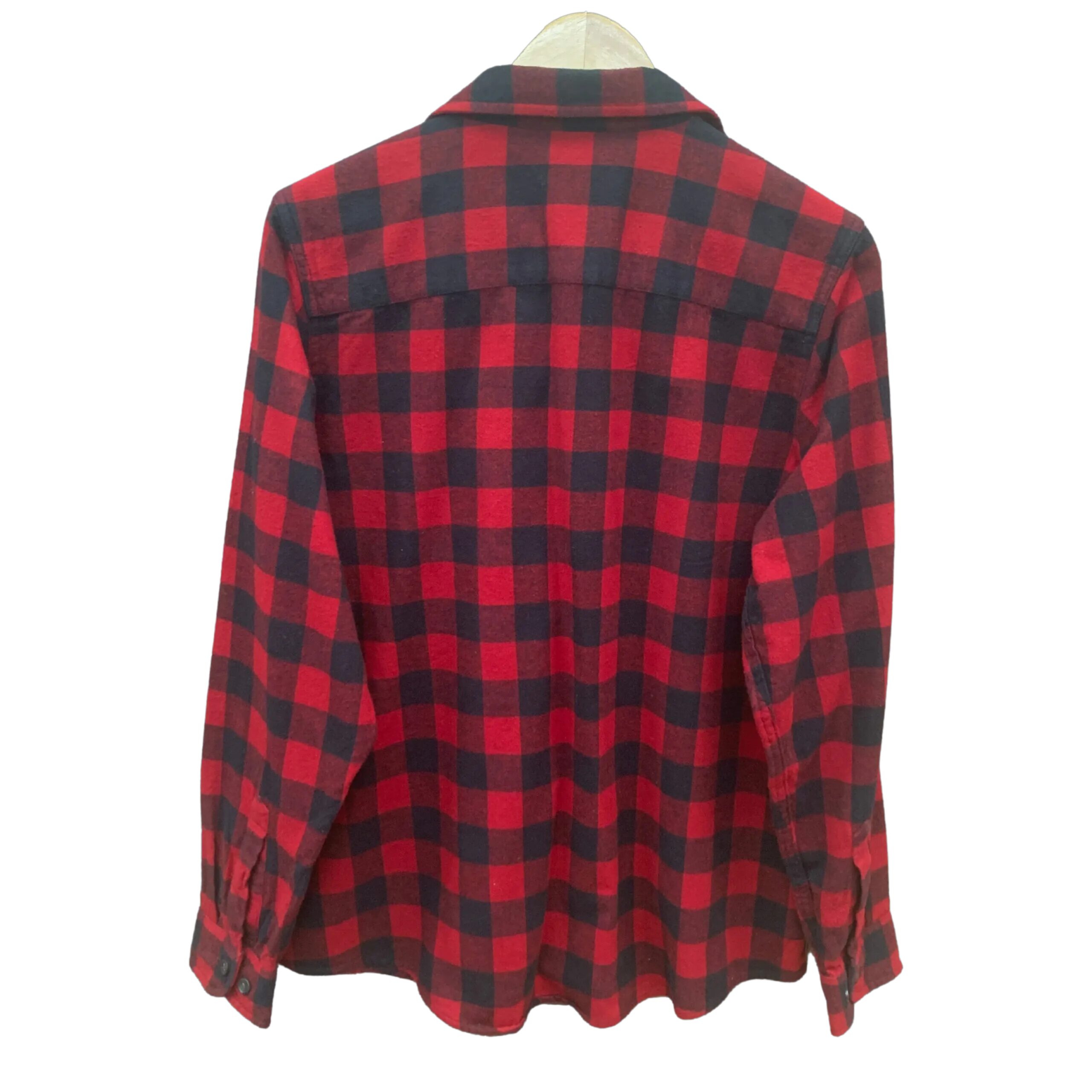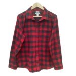 L.L. Bean Red and Black Plaid Flannel relaxed fit Shirt: This is a long-sleeved button-down shirt featuring a bold, classic red and black plaid pattern. It has a full button-front closure, a pointed collar, and a single patch pocket on the left chest. The sleeves have buttoned cuffs. The shirt has a soft, thick texture, characteristic of flannel, making it a warm and comfortable garment. Its timeless design is suitable for a wide range of casual occasions.
