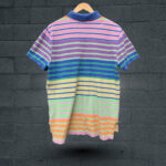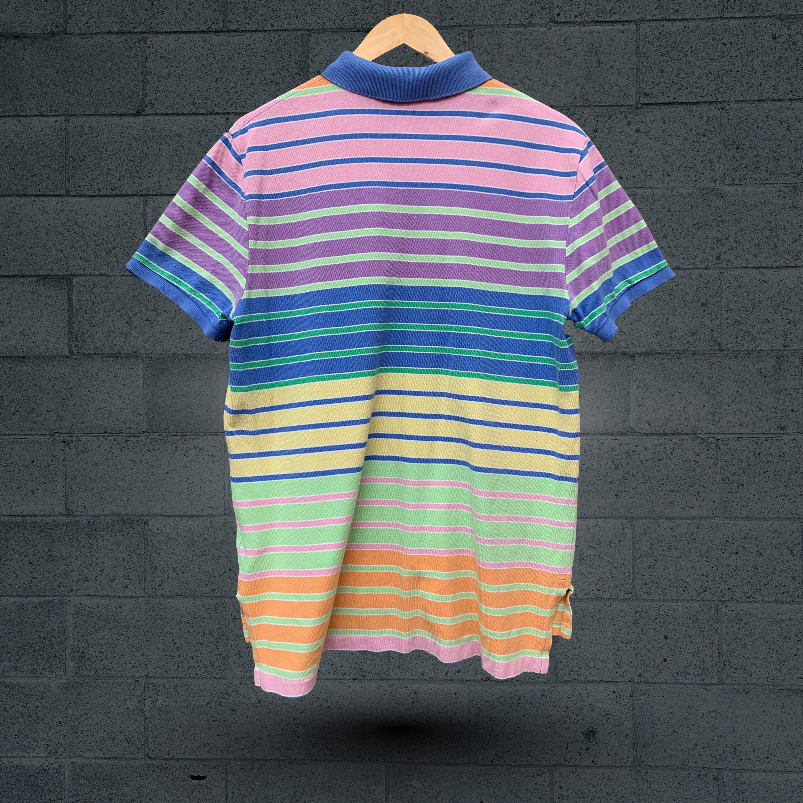 A brightly striped polo shirt in a variety of pastel and primary colors.