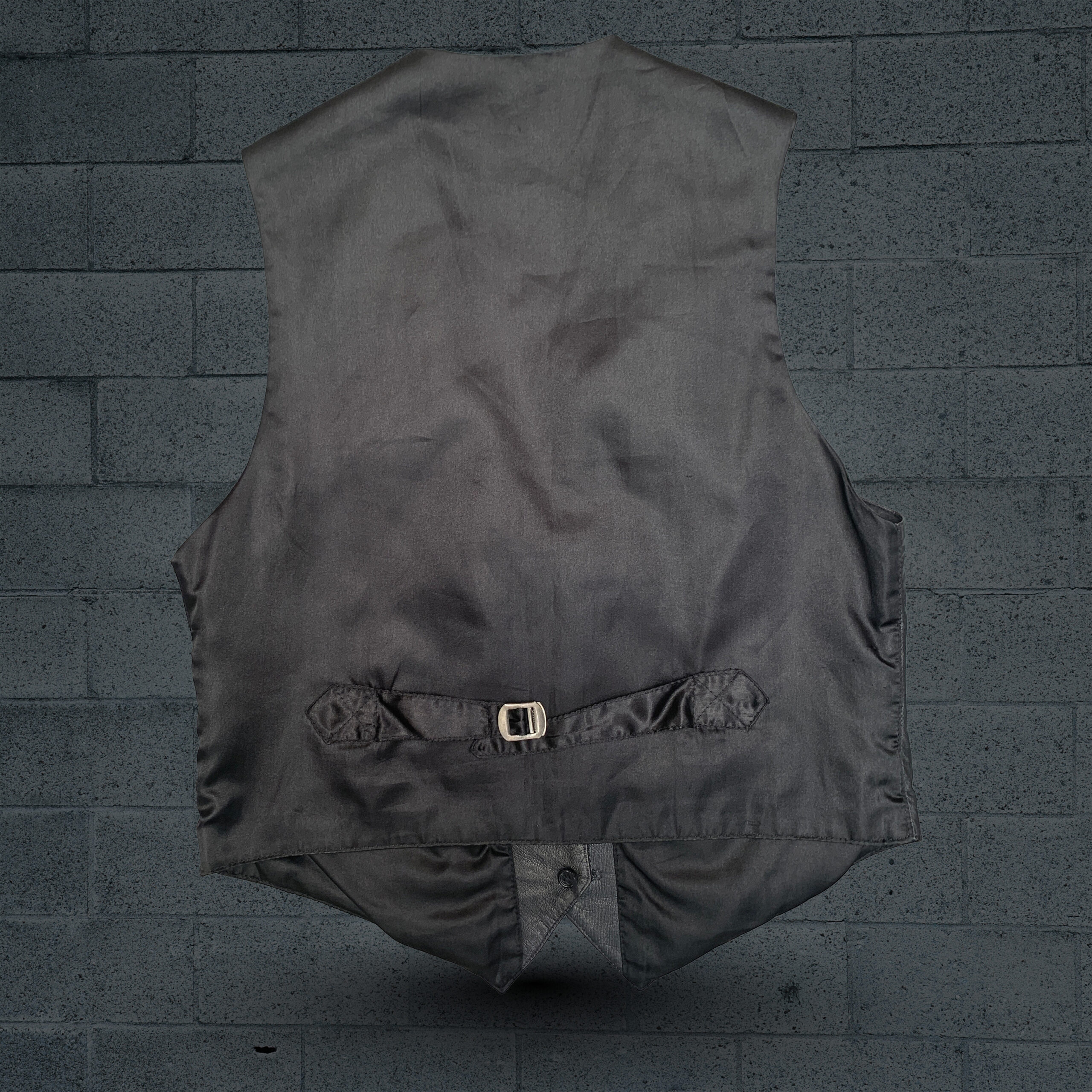 This black leather vest is a timeless fashion piece designed for both men and women. It features a classic V-neck cut with three front buttons for closure, offering a sleek and versatile look. Two side pockets add both function and style, while the smooth black interior lining ensures comfort. Displayed on a wooden hanger against grey wood panels, the vest highlights a polished design that can be styled as a standalone top or layered over shirts for a modern touch.