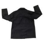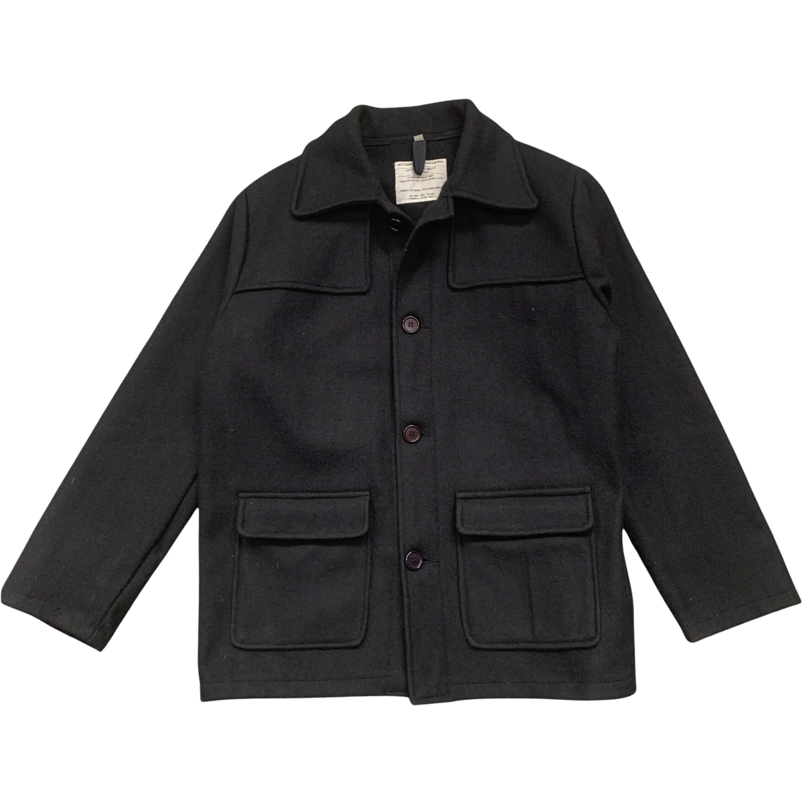 This is a black, long-sleeve wool jacket with a classic and structured design. It features a full button-down front with large buttons and four prominent patch pockets on the front.