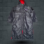 NBA Black Parka/Jacket with Red Lining: This is a long, black parka-style jacket with a full-zip front closure and a red interior lining. The jacket has an attached hood and a small “NBA” logo embroidered on the left chest in red and blue. Red panels are visible on the sides of the jacket, providing a pop of color against the black body. The sleeves are long and have elasticated cuffs, and the hem is adjustable, making it a functional and warm coat. Please note some writing is scratched on the back motif.