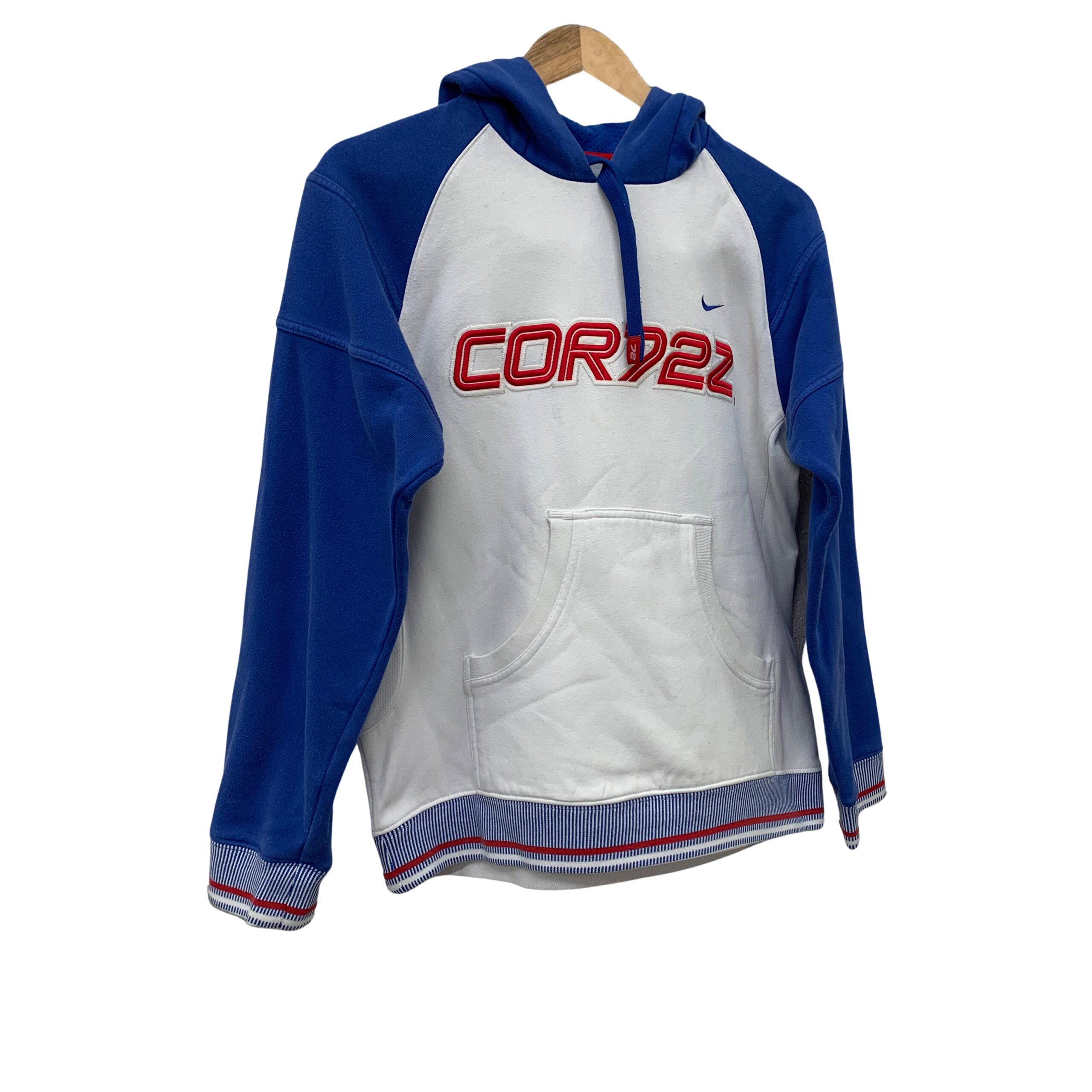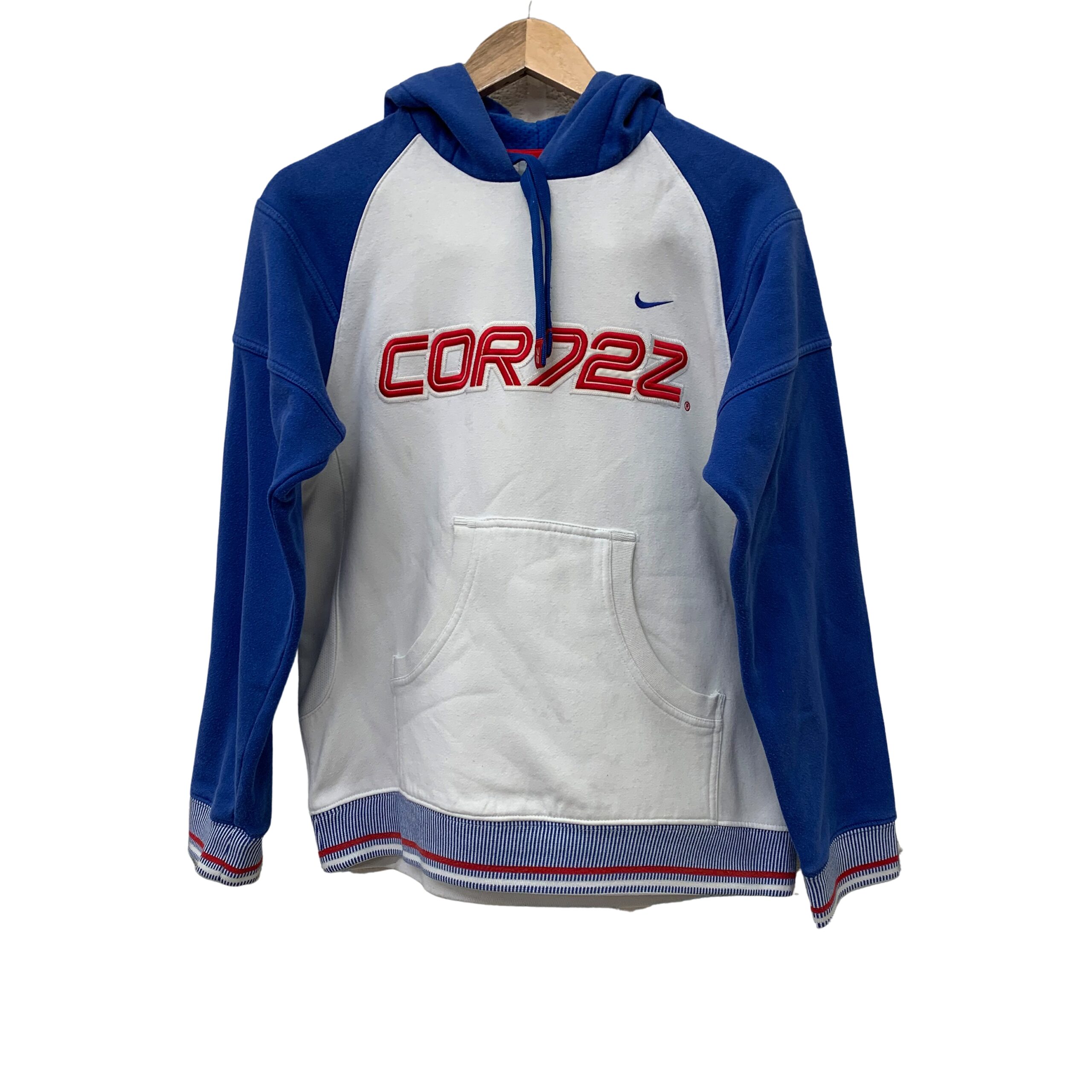 Nike “CORDEZ” Colorblock Hoodie: White body with blue sleeves and hood, featuring red “CORDEZ” text and a blue Nike swoosh on the front. Includes a kangaroo pocket and striped ribbed cuffs/hem.