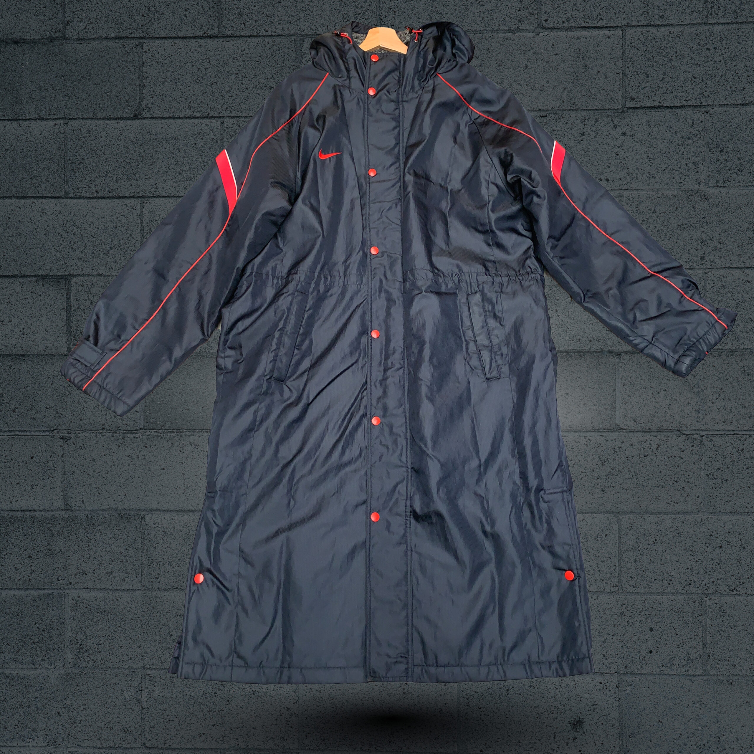 Nike Navy Blue Parka: Long navy blue jacket with red buttons and piping, a red Nike swoosh on the chest, and a drawstring waist.
