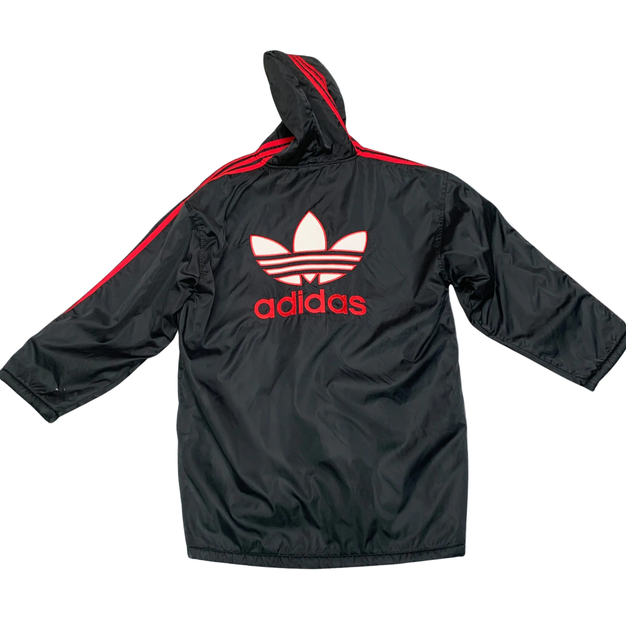 Adidas Black Parka Jacket: Black winter jacket with a white sherpa-lined hood, red three-stripe detail on the sleeves, and a red Adidas Trefoil logo on the chest.