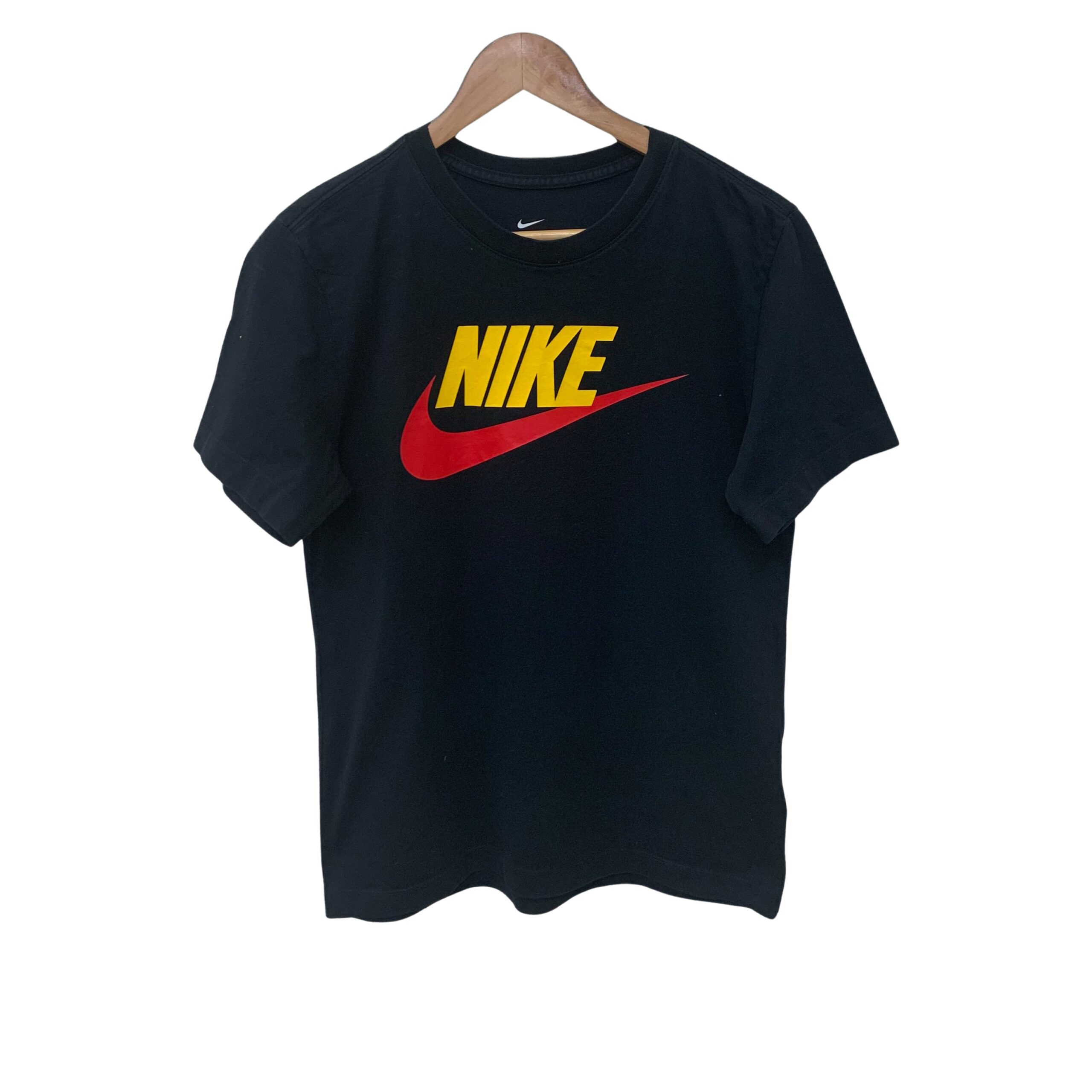 Nike Black Graphic T-Shirt: Short-sleeved, black t-shirt with a prominent yellow “NIKE” wordmark and red swoosh graphic on the front.