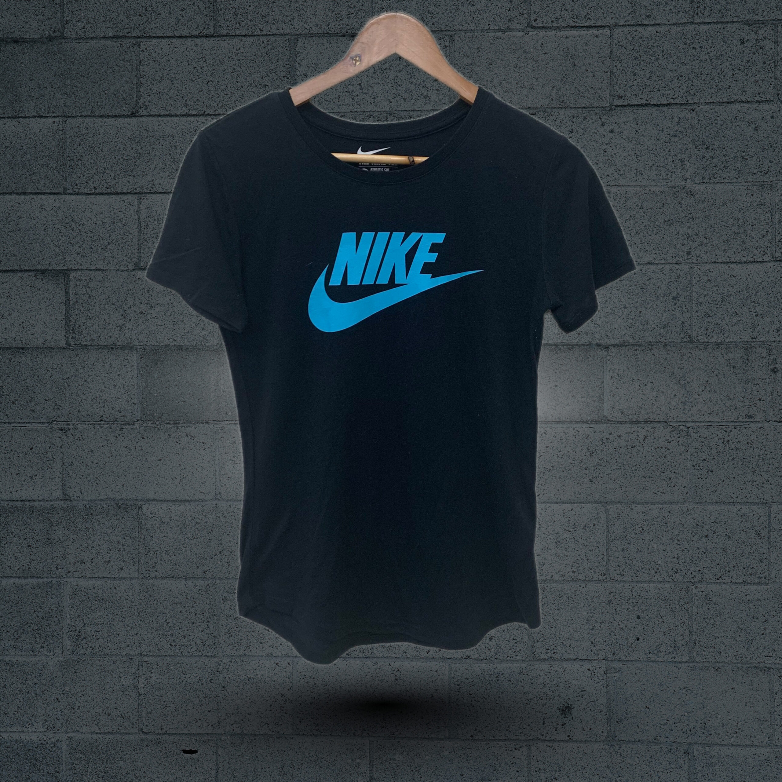 Nike Black Graphic T-Shirt: Short-sleeved, black t-shirt with a large turquoise blue “NIKE” wordmark and swoosh graphic on the front.