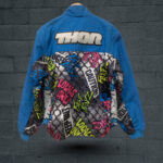 Blue Jacket with Patterned Sleeves: Bright blue jacket with a high collar, full-button front, zippered chest pocket, and vibrant, multi-colored graphic patterned sleeves.