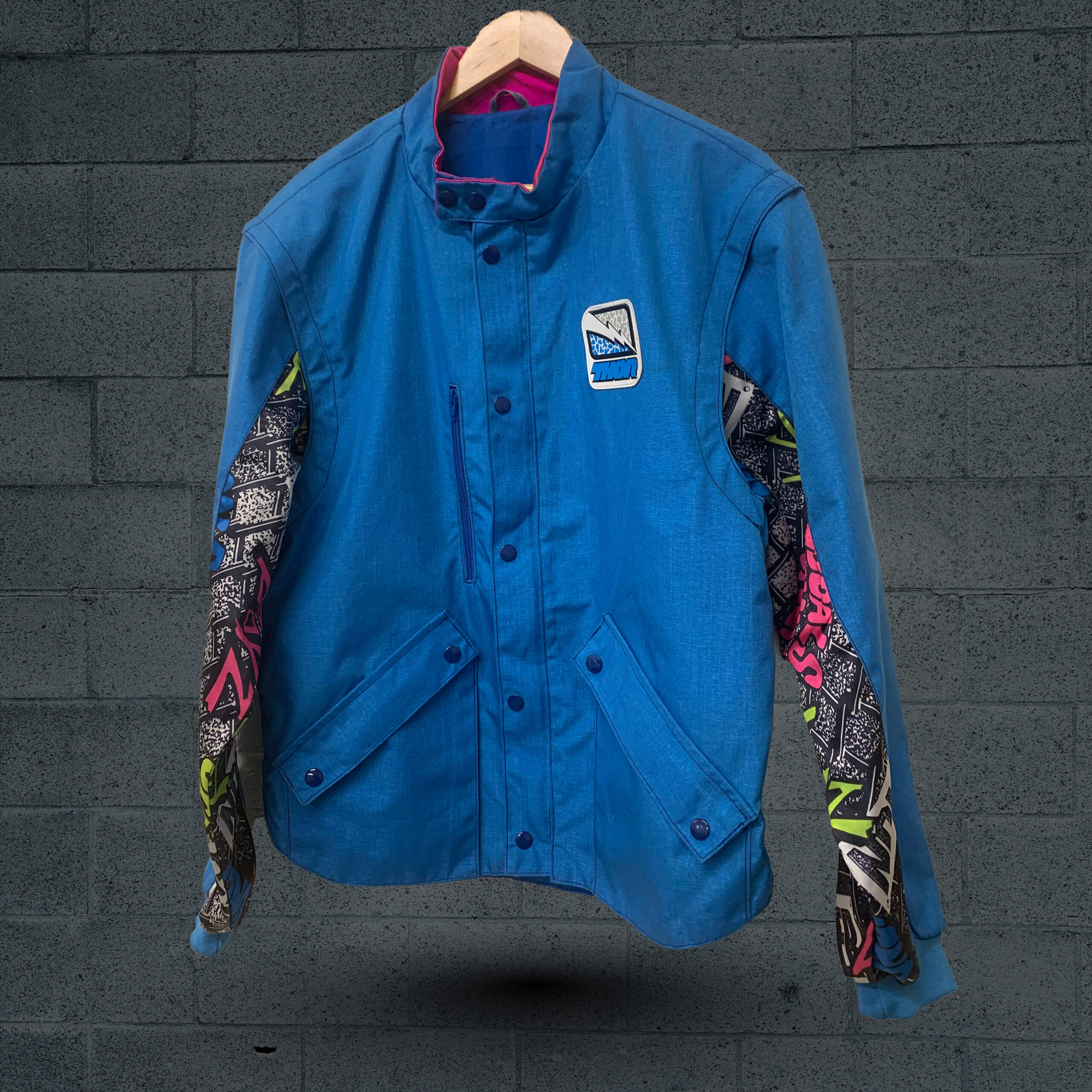Vibrant Blue and Patterned Jacket: This is a striking jacket primarily in a bright blue color. It features a high collar with a snap closure, and a full-button front placket with blue buttons. A vertical zippered pocket is located on the left chest. The most distinctive feature is the long sleeves, which are adorned with a bold, multi-colored graphic pattern. This pattern incorporates black, white, bright pink, neon yellow/green, and possibly other colors in an abstract or graffiti-like design. There are two additional snap-closure pockets towards the bottom front of the jacket. The interior lining of the collar appears to be a contrasting pink color. The overall style suggests a vintage, possibly 80s or 90s, activewear or casual jacket.