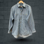 A light blue pinstripe denim shirt with a classic collar, front button closure, and two chest pockets with buttoned flaps.