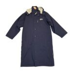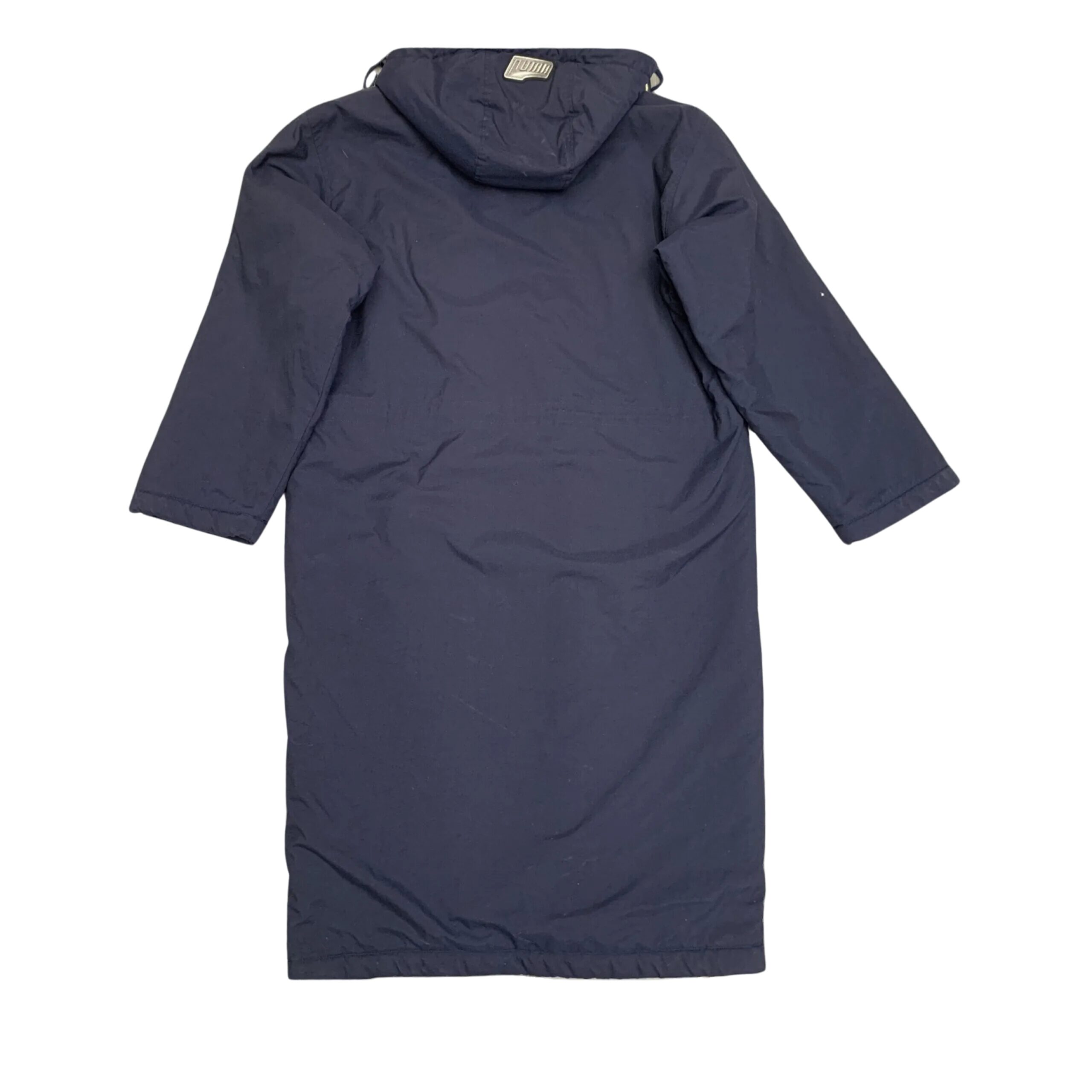 This is an authentic vintage Puma long winter coat, perfect for staying warm in cold weather. Made from a durable navy blue material, this parka has a full-length snap-button front and a unique, light-colored sherpa-lined collar and hood for exceptional warmth. The Puma wordmark and logo are subtly embroidered on the chest. With its extended length and sturdy construction, this jacket is a classic example of Puma’s sideline or bench gear, offering both function and timeless sporty style.