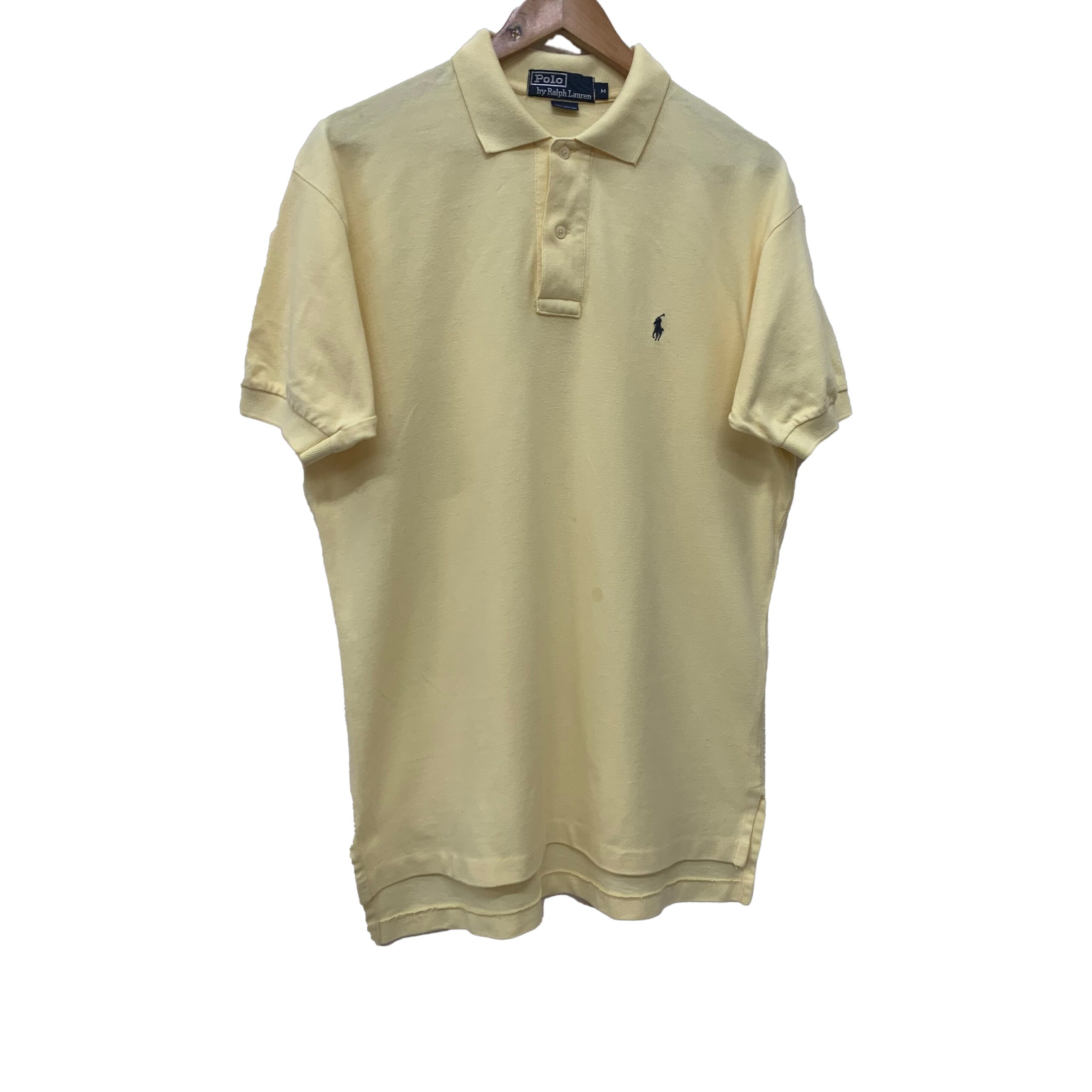 Polo Ralph Lauren Yellow Polo Shirt: Short-sleeved, yellow polo with a two-button placket and a navy embroidered Polo Pony logo on the chest.