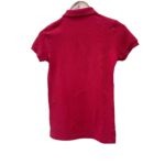 Ralph Lauren Women’s Red Polo Shirt: This is a vibrant red, short-sleeved polo shirt designed for women. It features a classic flat knit collar and a four-button placket with white buttons, extending from the collar. The shirt has a fitted silhouette. On the left chest, the iconic Ralph Lauren Polo Pony logo is subtly embroidered in a matching red thread, creating a tonal effect. The fabric appears to be a pique knit, characteristic of traditional polo shirts, offering both comfort and breathability.
