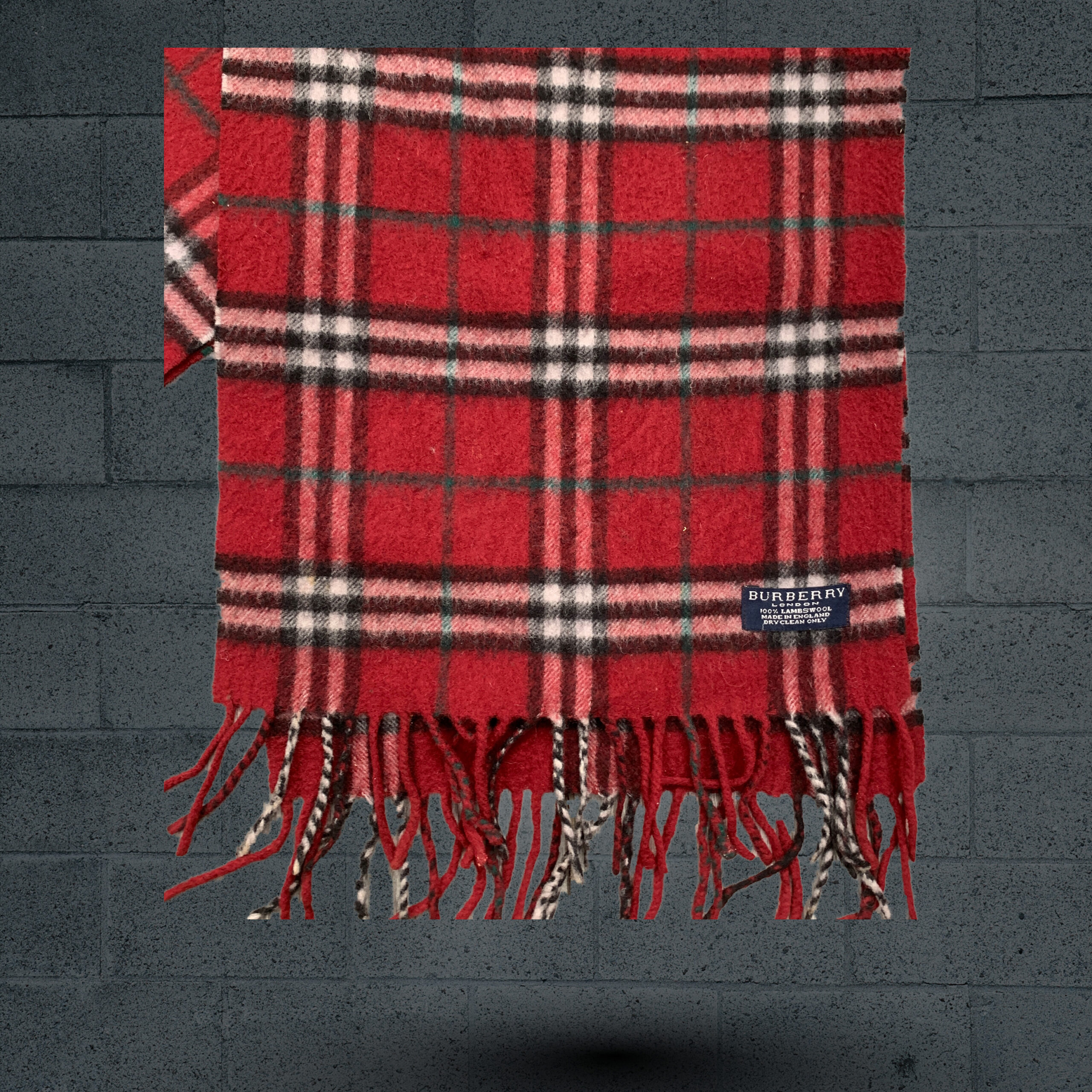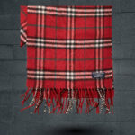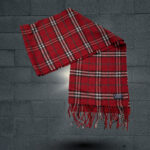 This red plaid scarf is laid out on a light wooden surface. The scarf has a classic plaid pattern with red, black, and white colors. It is folded diagonally showing part of its length. The bottom edge has tassels adding a decorative touch. A small tag is visible on the bottom-right corner. The scarf looks cozy and suitable for winter wear.