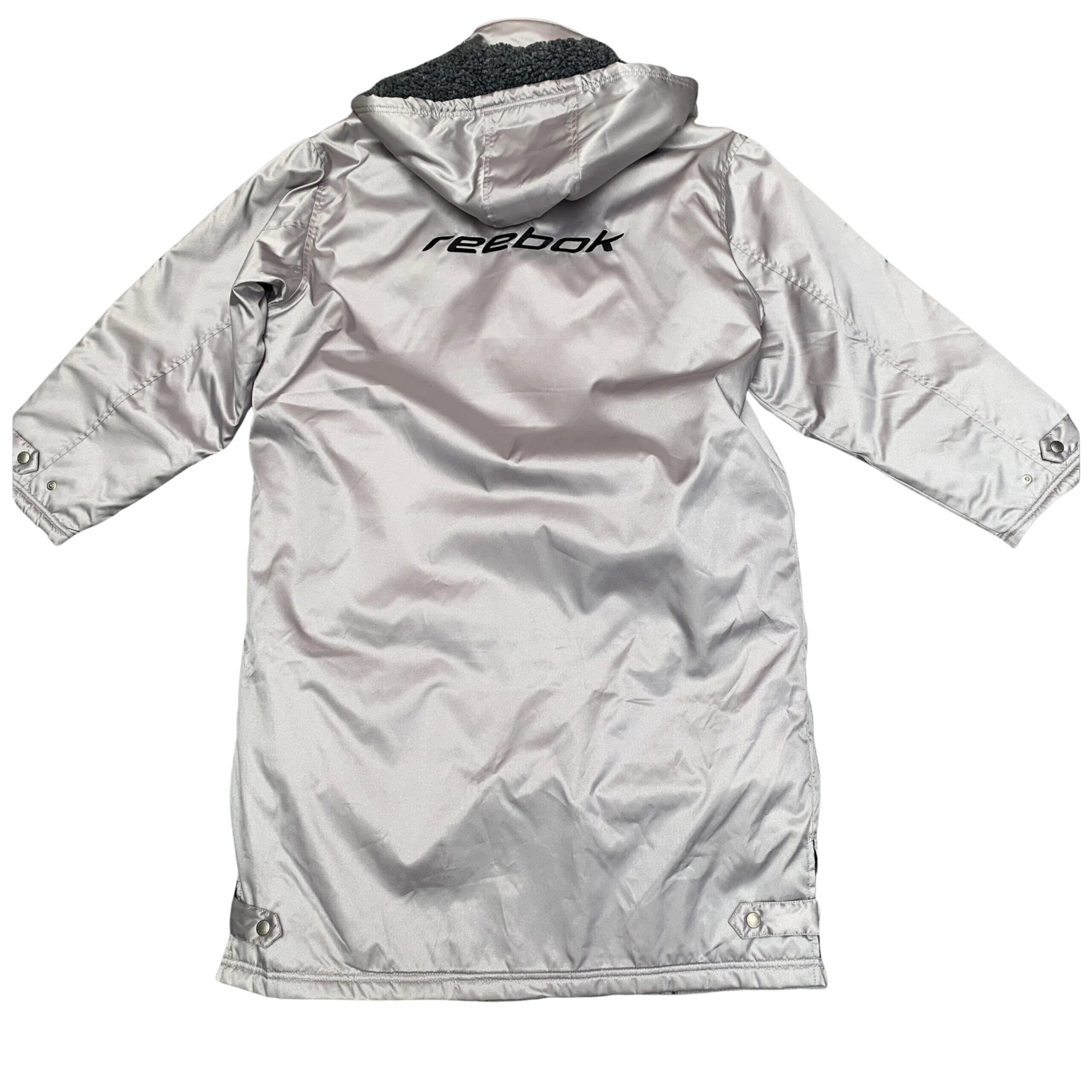 A long, light gray Reebok winter coat with a metallic sheen. It has a full snap-button and zipper closure, a cozy sherpa-lined hood, and multiple Reebok logos on the chest and sleeve.