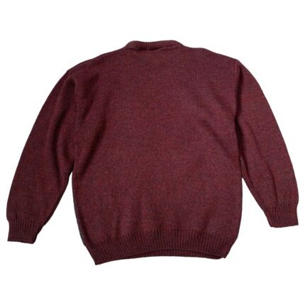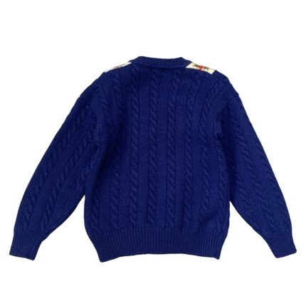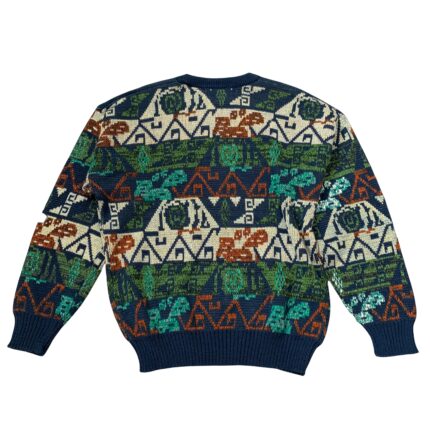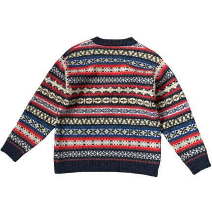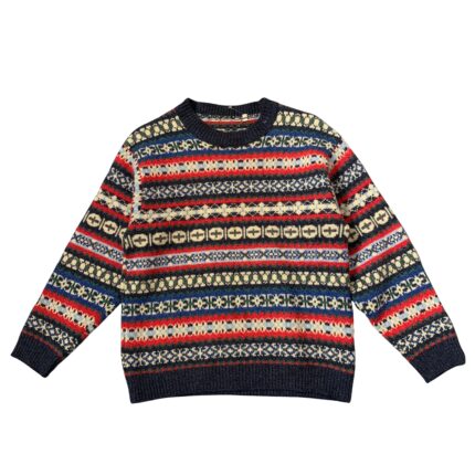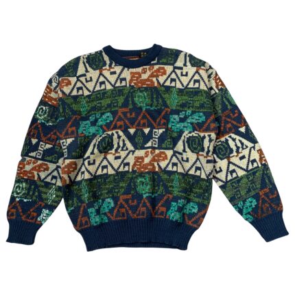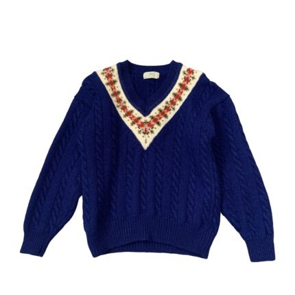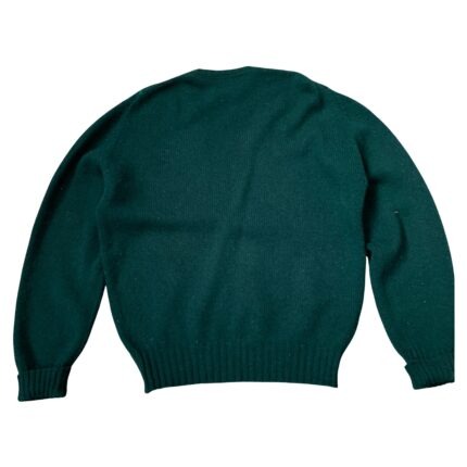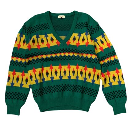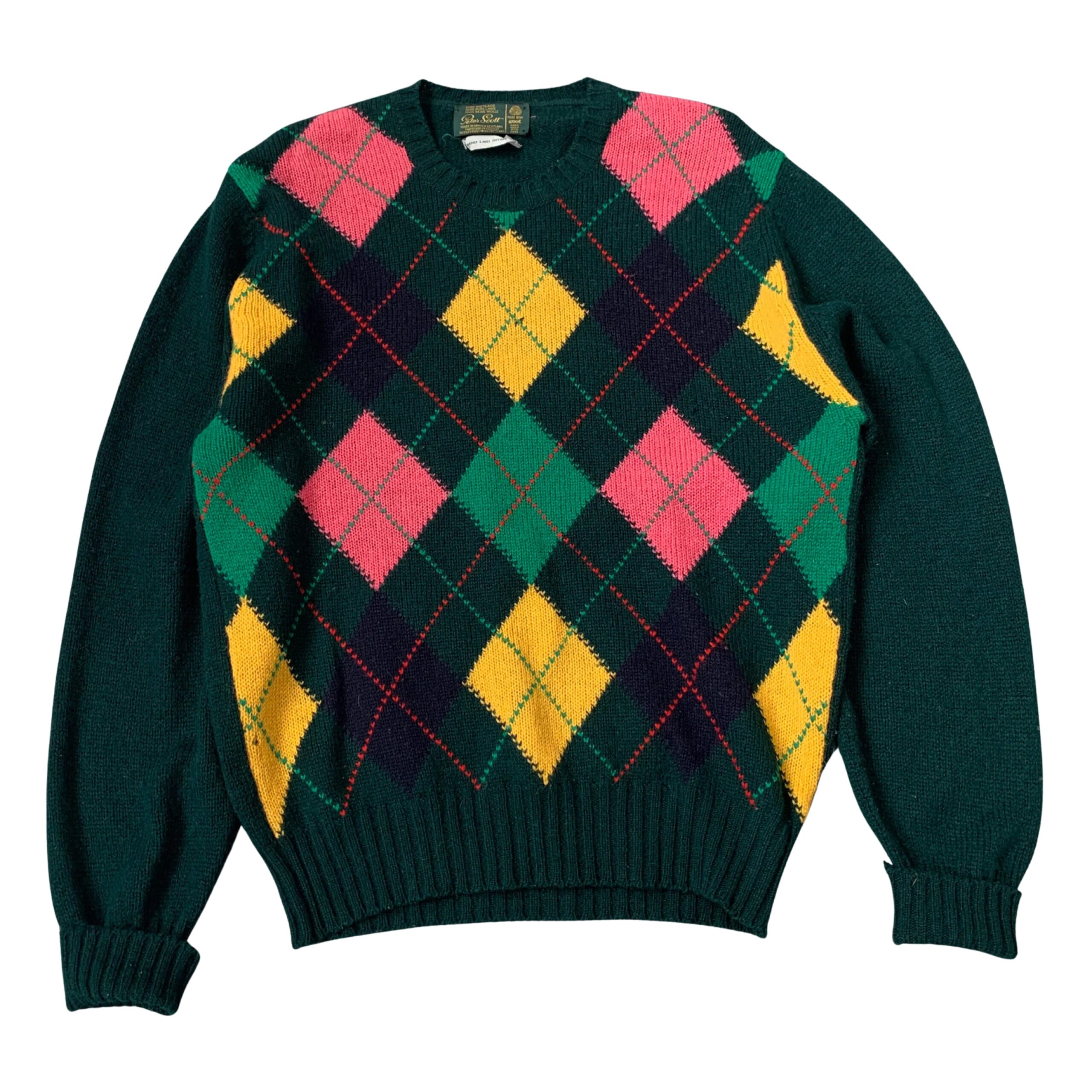This dark green argyle sweater has a bold pattern of pink, yellow, and green diamonds. It’s a stylish piece with a retro touch