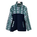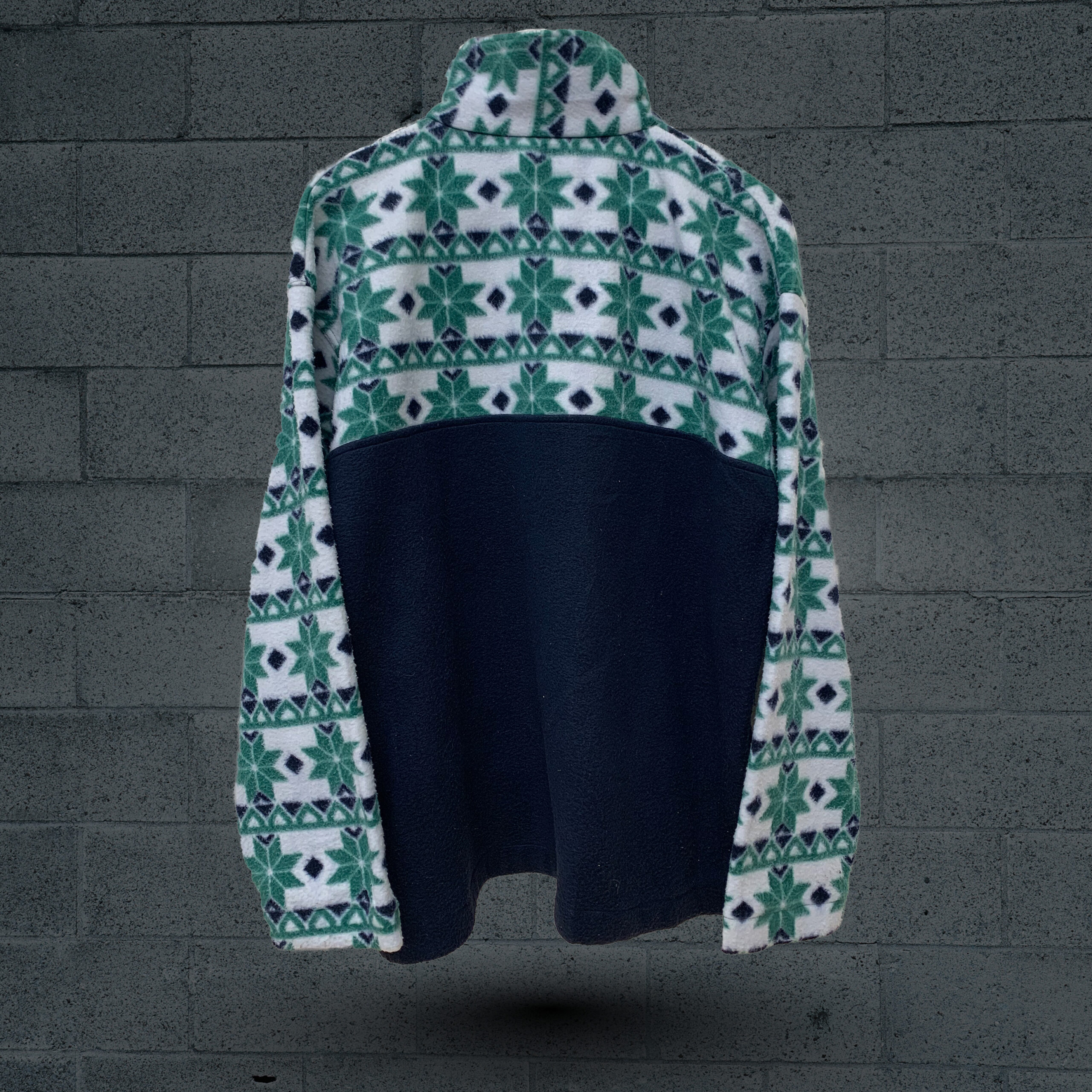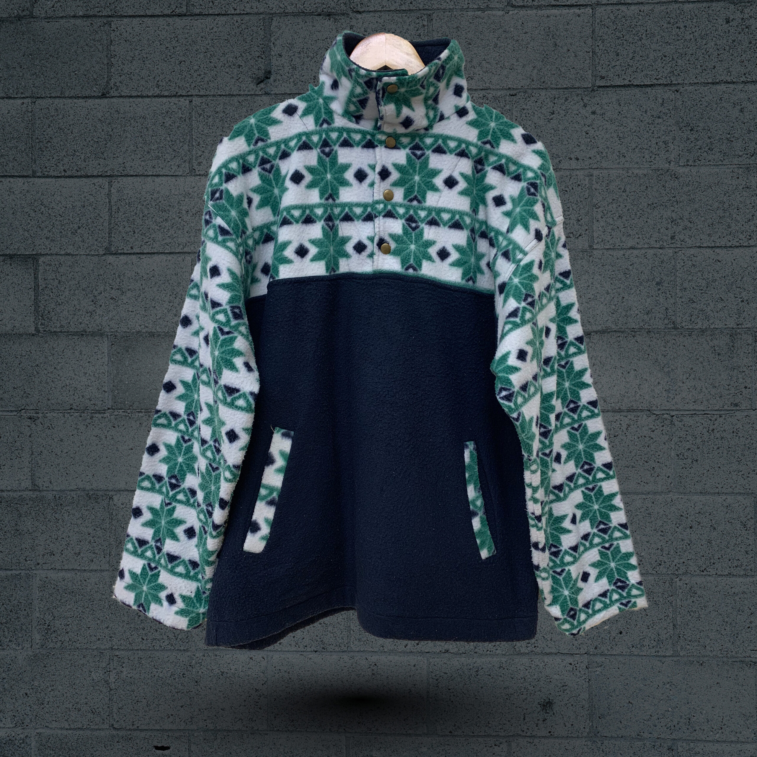 This is a vintage-style fleece pullover with a distinctive color-block design. The top half and sleeves feature a bold geometric pattern of white, green, and navy blue stars or snowflakes. The bottom half of the pullover is a solid navy blue. It has a high collar with a partial snap-button placket and two vertical hand pockets. The material appears to be soft, warm fleece. The style is reminiscent of popular outdoor and casual wear from the 1990s. There is no visible branding.